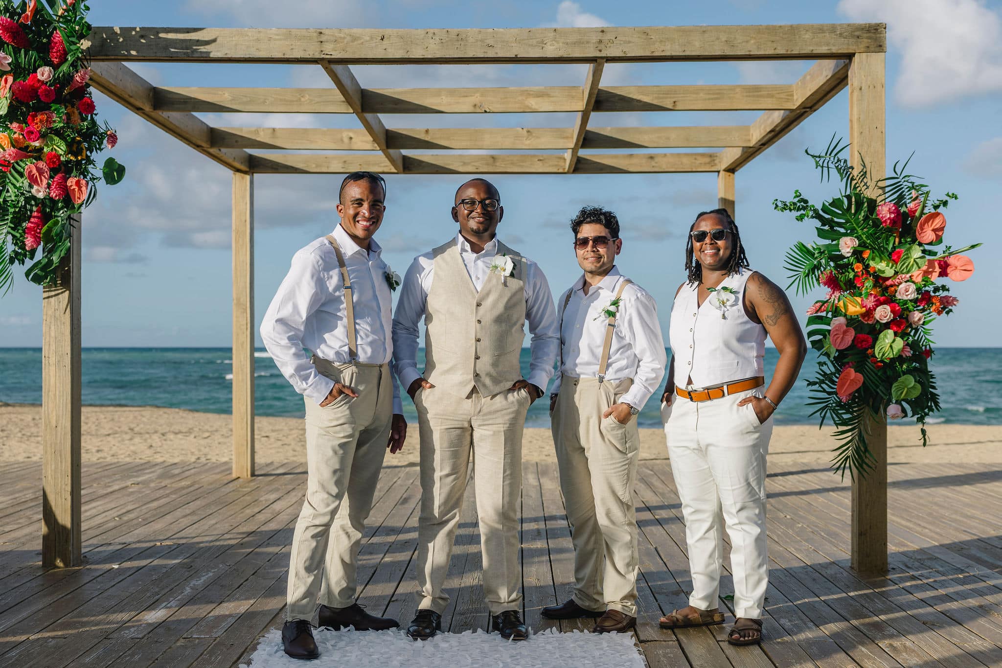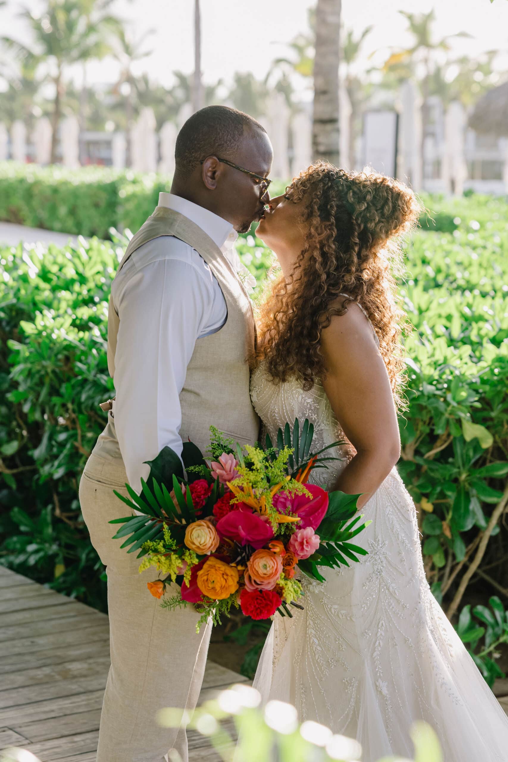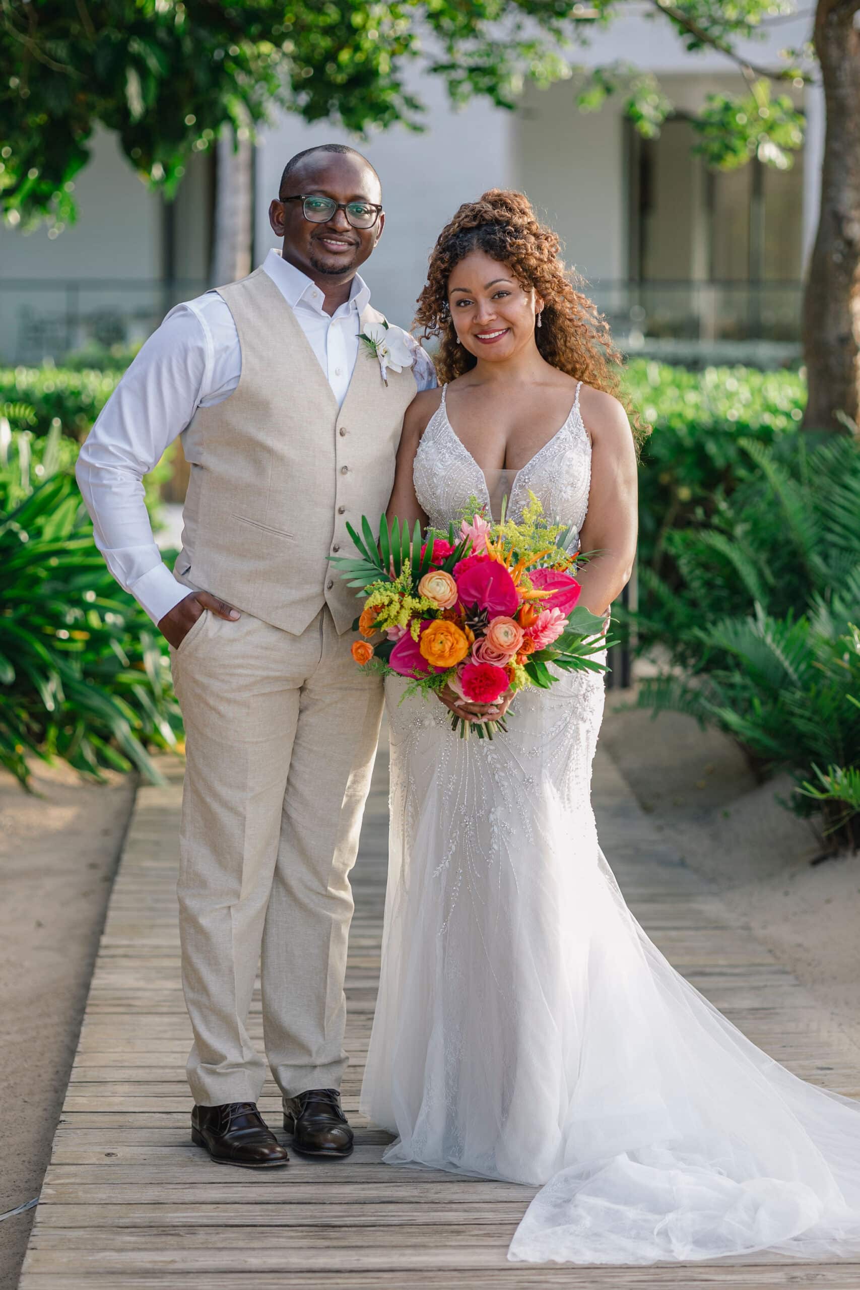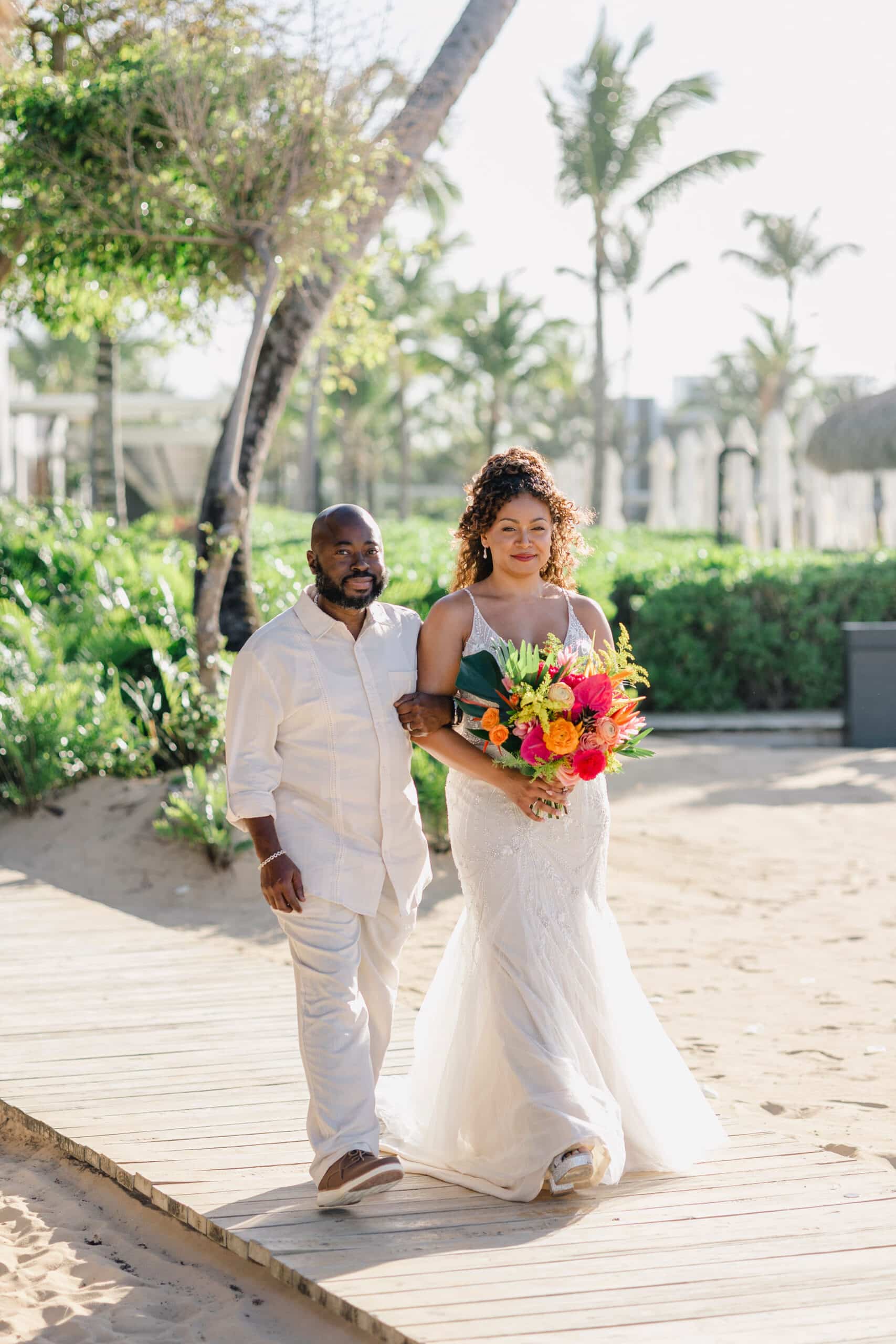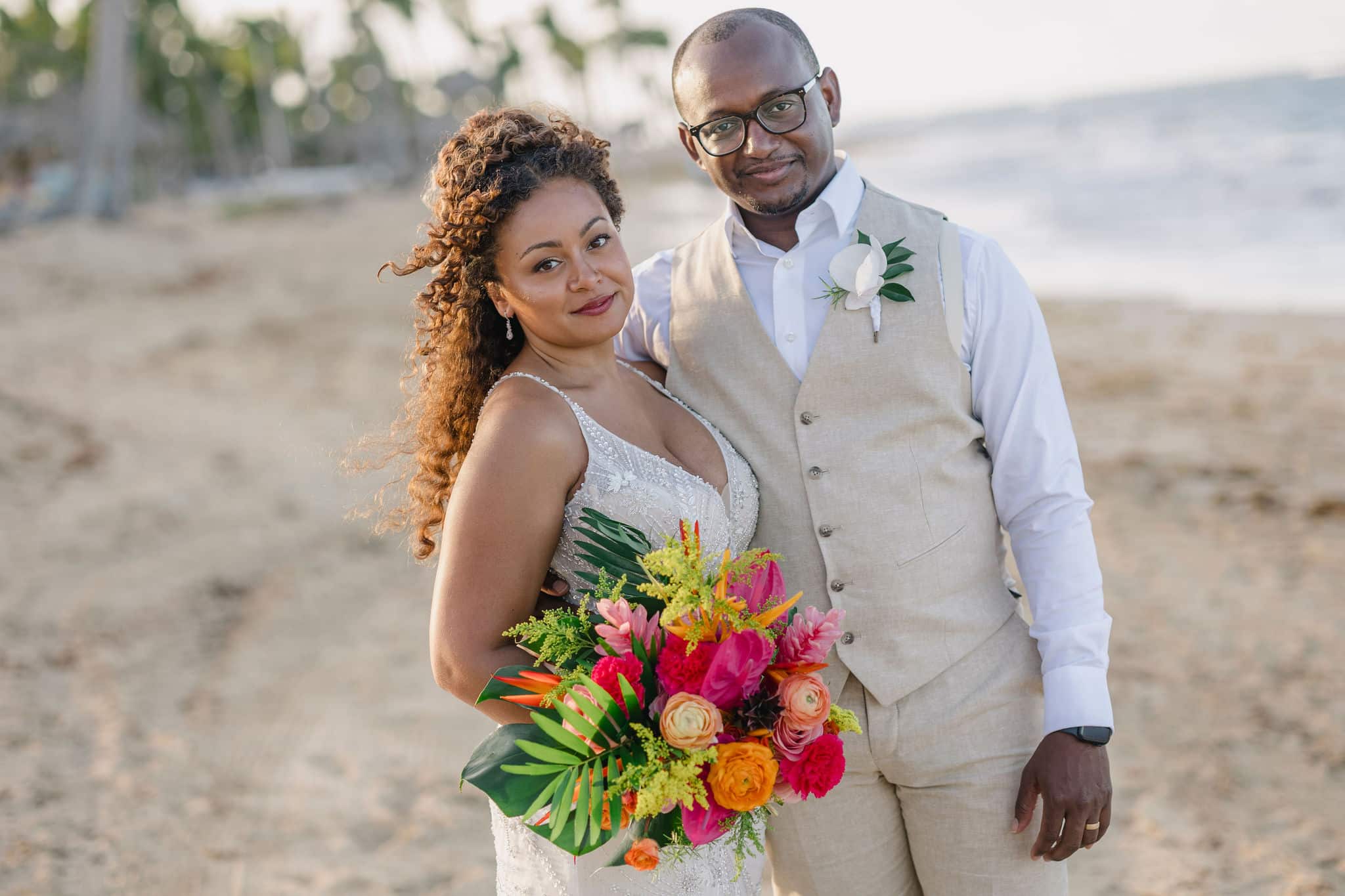 Brittany and Nixon’s wedding at Finest Resorts Punta Cana was a celebration bursting with color, energy, and heartfelt emotion. From the vibrant tropical florals to the serene sea breeze that welcomed their guests, every detail was crafted with intention and love. The bride’s bouquet, an explosion of pinks, oranges, and lush greens, set the tone for a joyful and visually stunning day. As she got ready in her elegant suite, laughter and anticipation filled the air. Nixon’s neutral-toned vest and natural backdrop highlighted the perfect blend of casual beach style and refined sophistication.