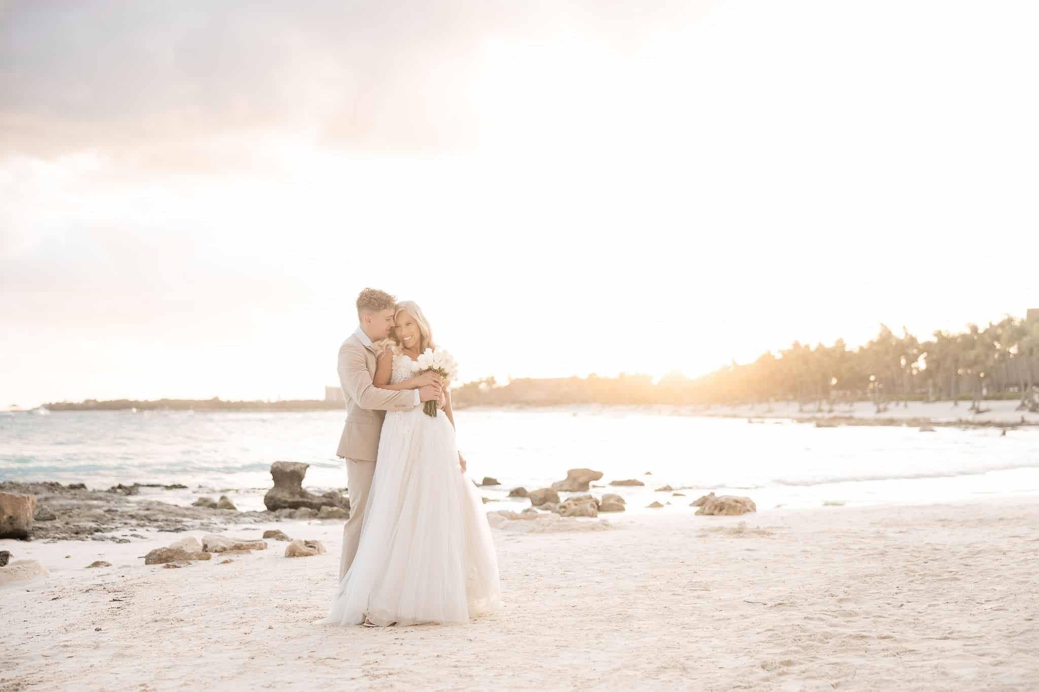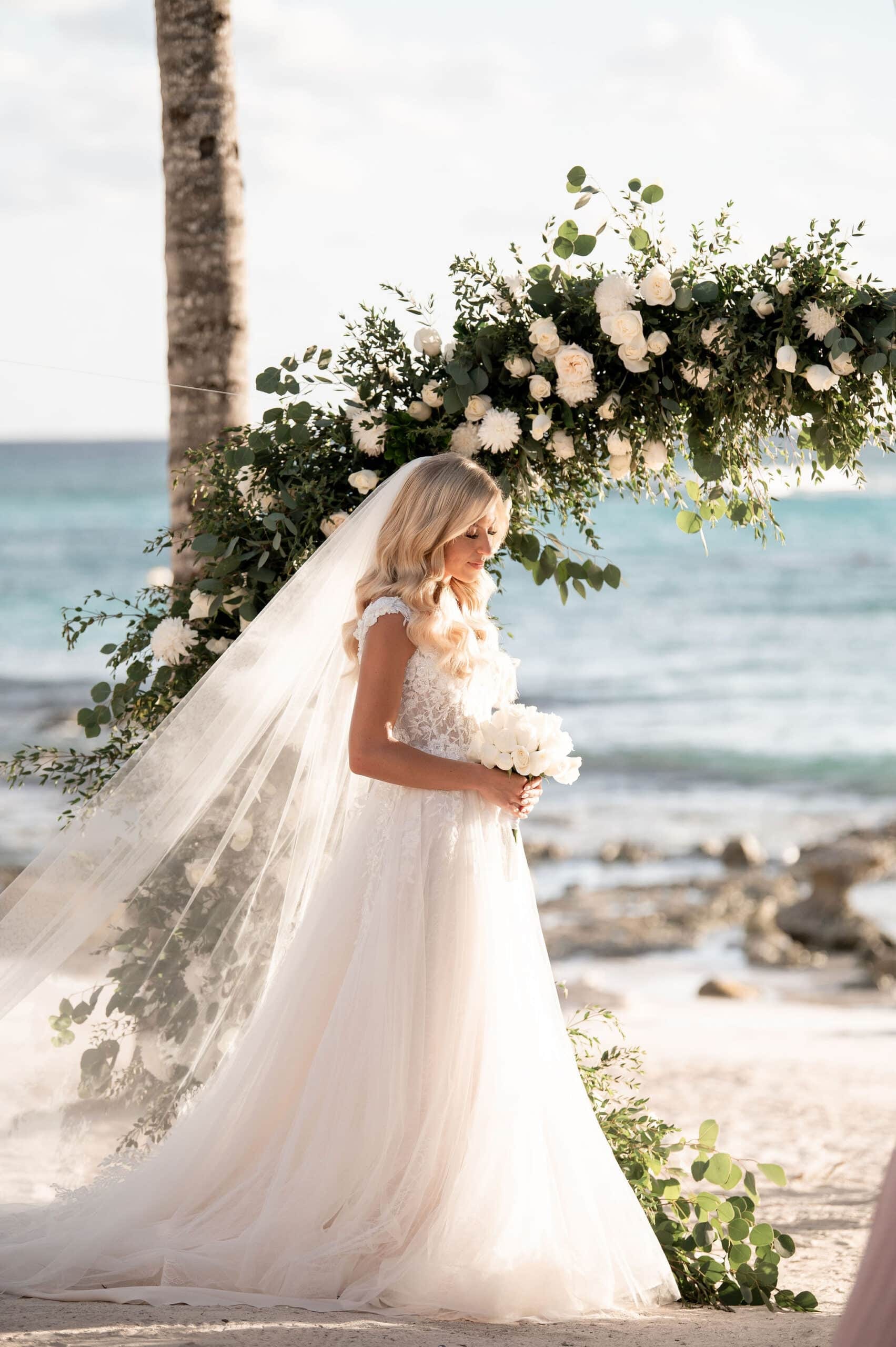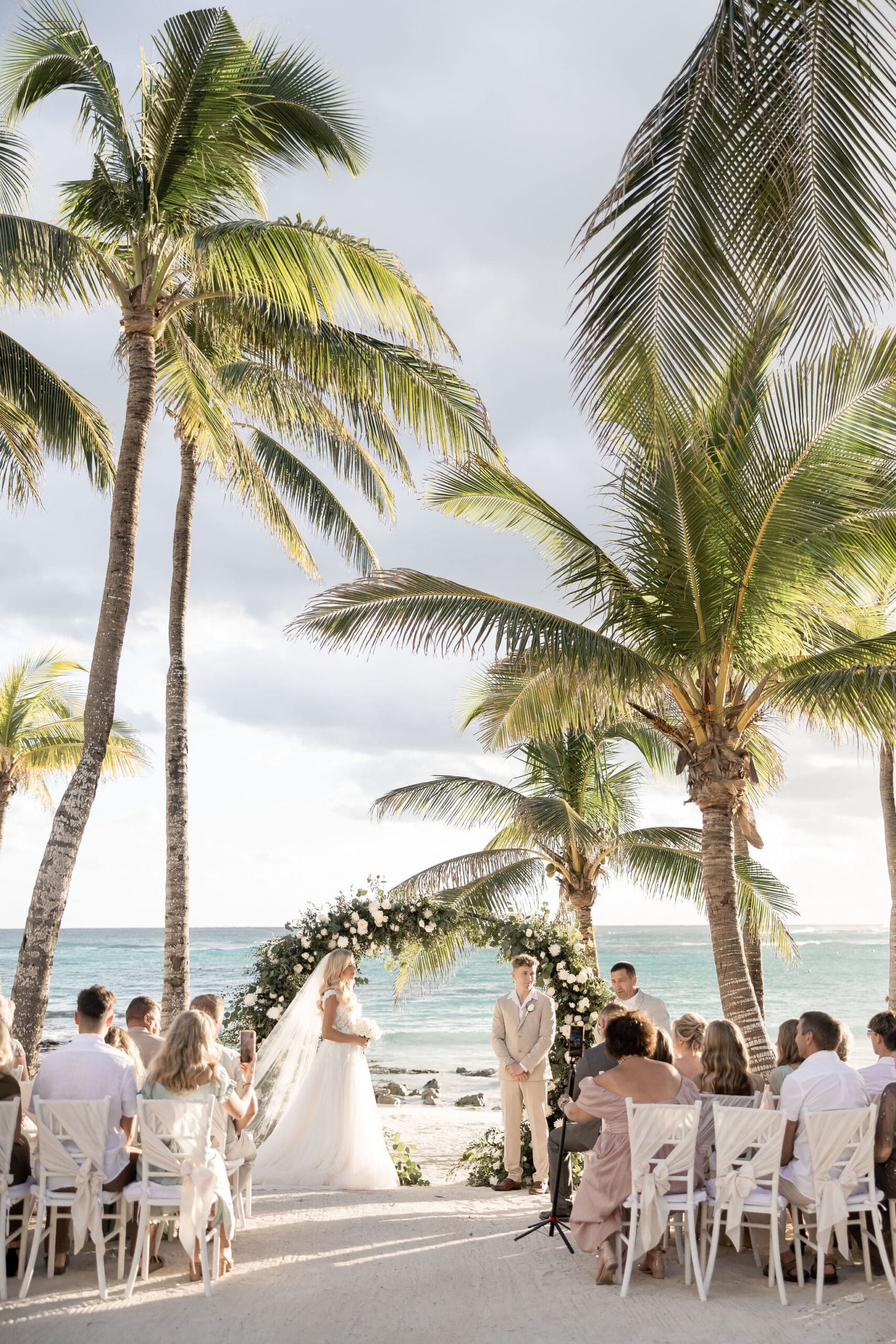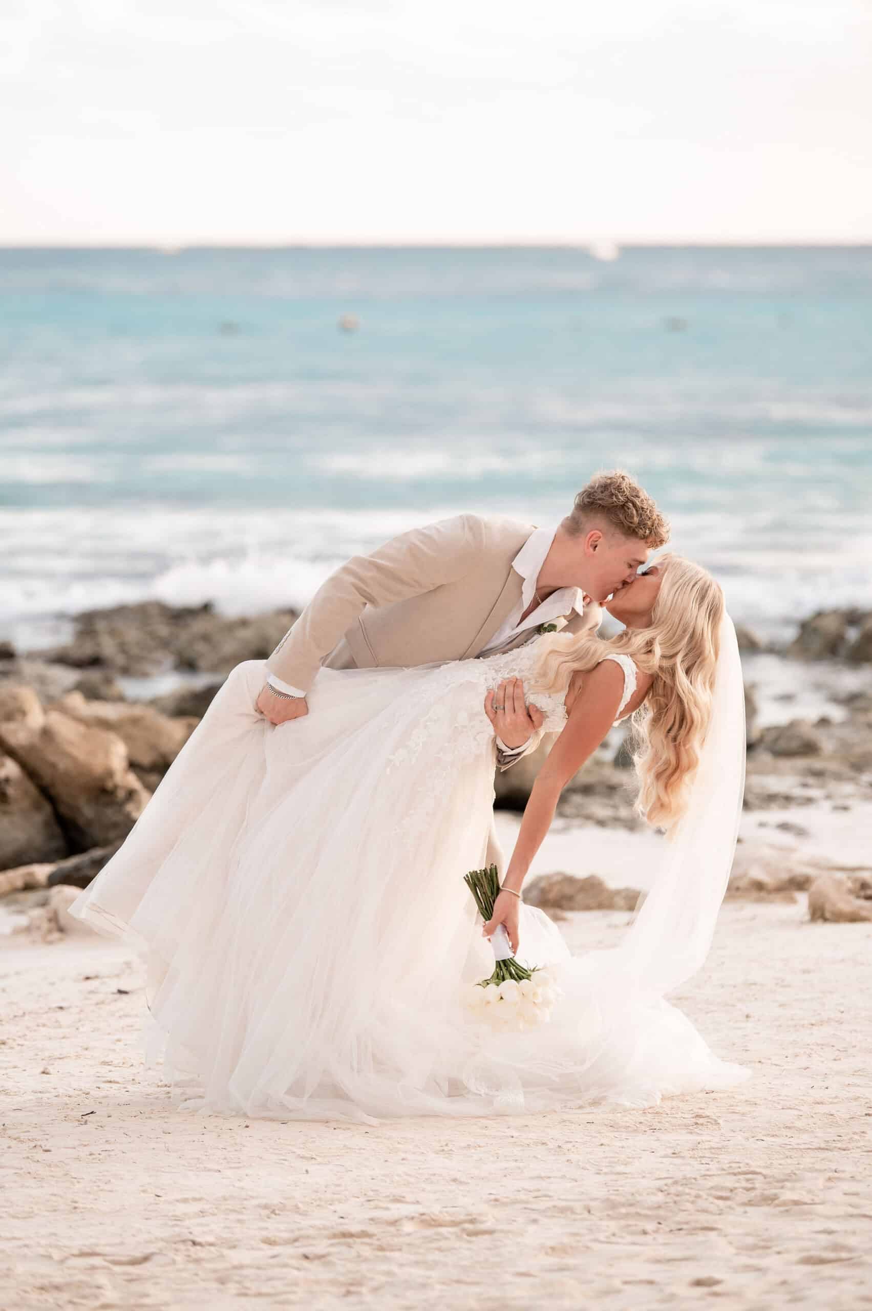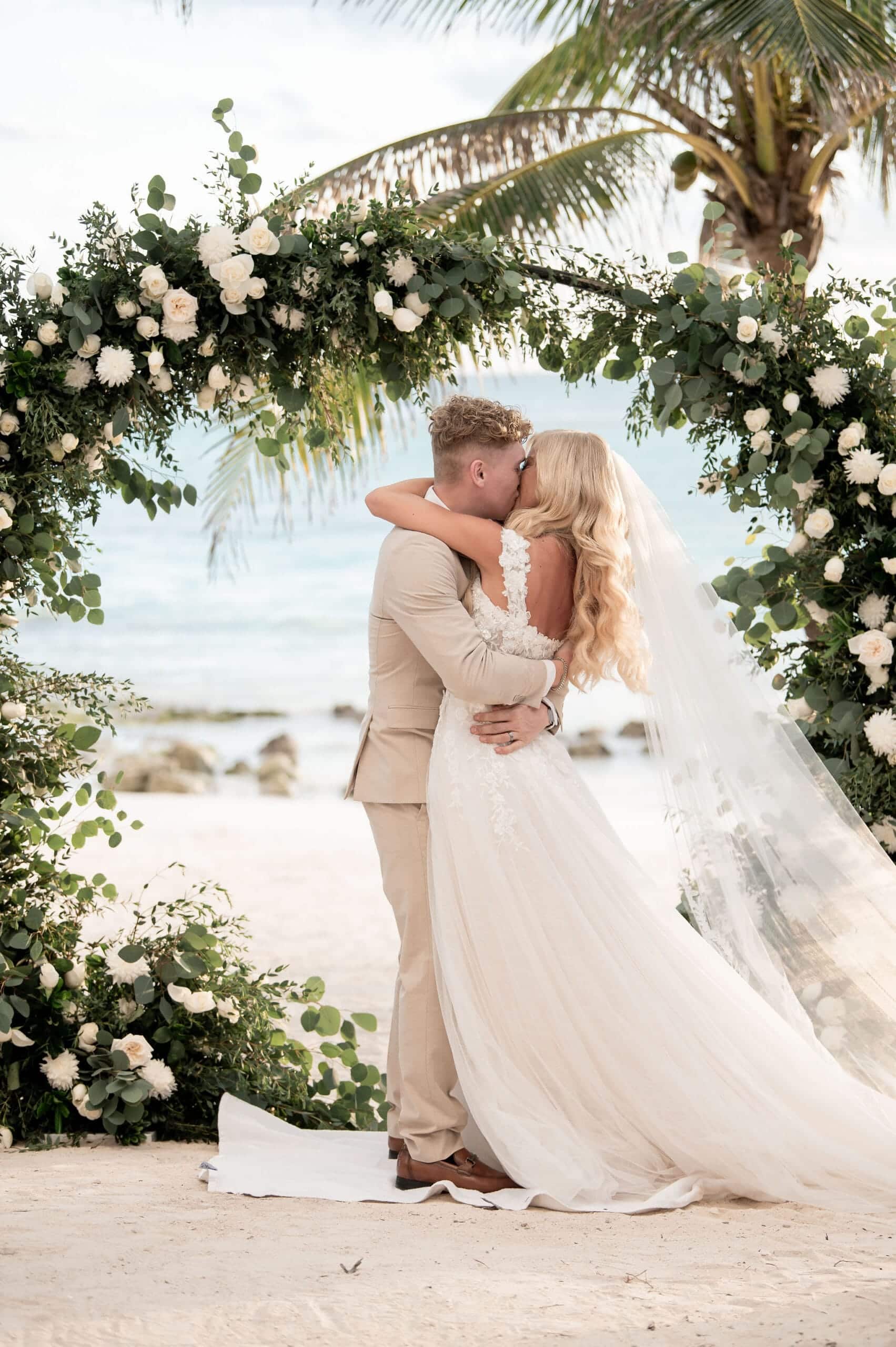 Deanna and Timothy’s wedding at Barceló Maya Palace was a breathtaking celebration set along the stunning Riviera Maya coastline. The couple exchanged vows under a romantic floral arch, with the turquoise waters of the Caribbean and swaying palm trees providing the perfect backdrop. Deanna, radiant in her lace gown and carrying a bouquet of pristine white roses, walked down the sandy aisle to meet Timothy, who was beaming with joy. The natural beauty of the beachfront setting, combined with elegant decor and the golden glow of the setting sun, created a truly magical atmosphere for their ceremony.