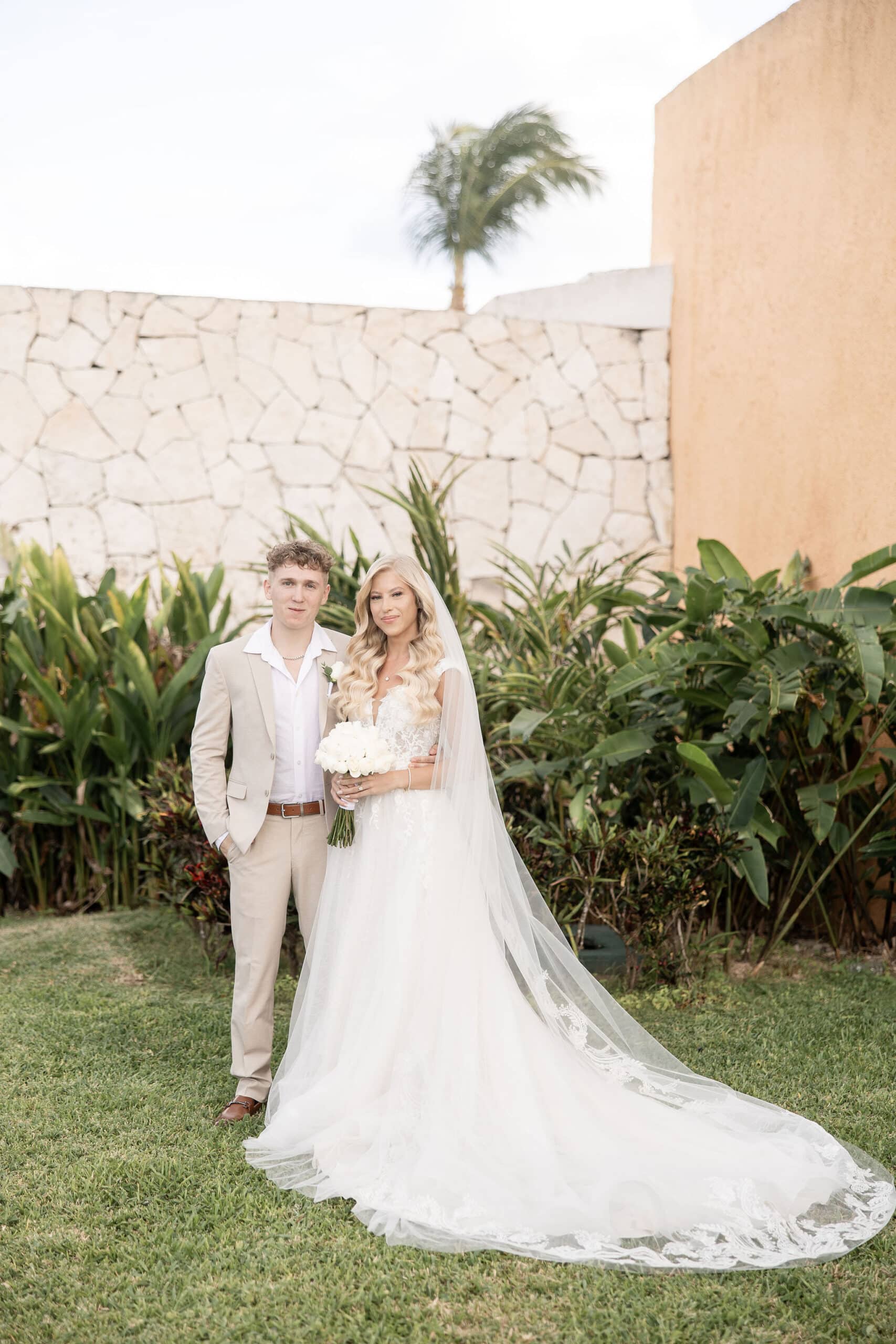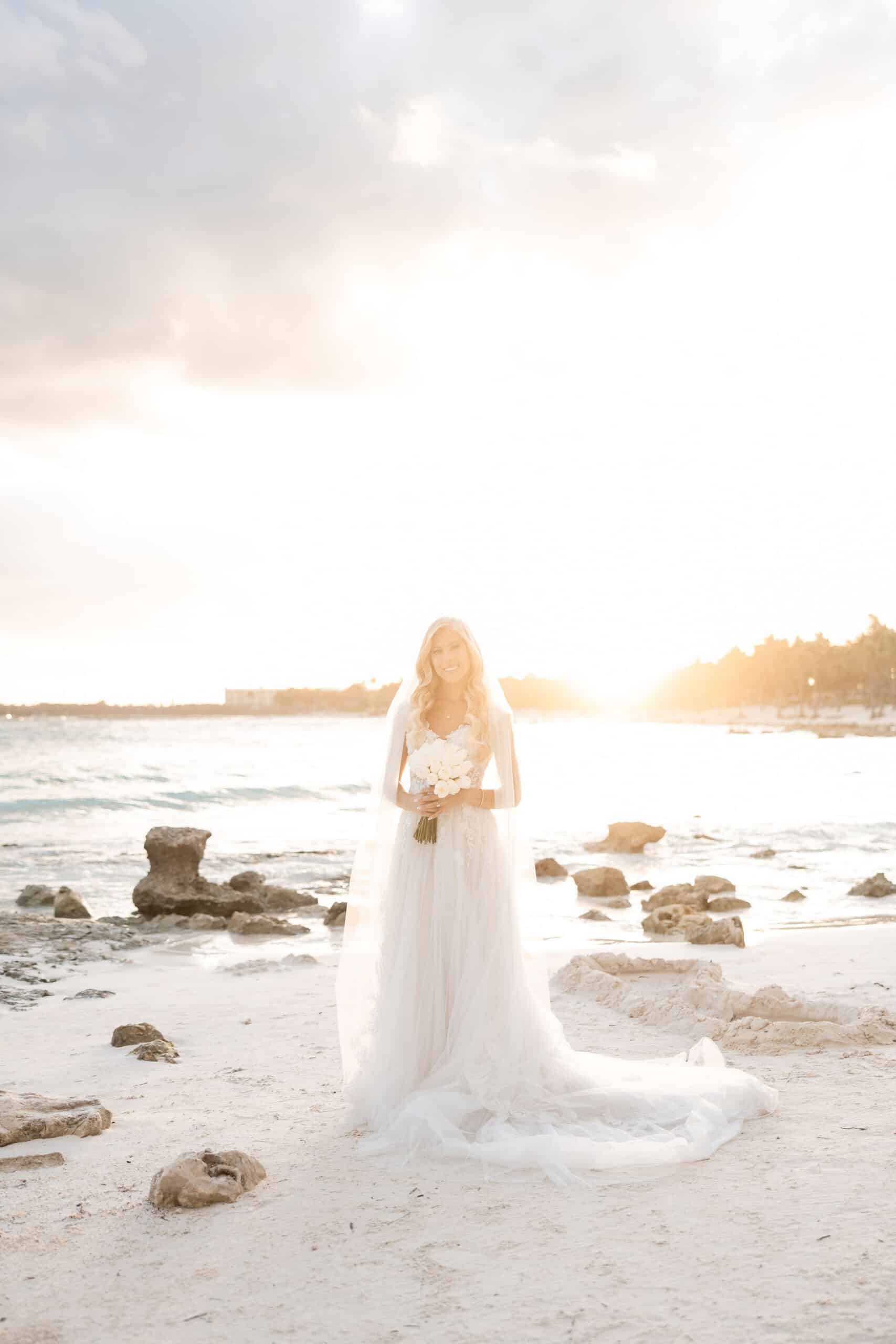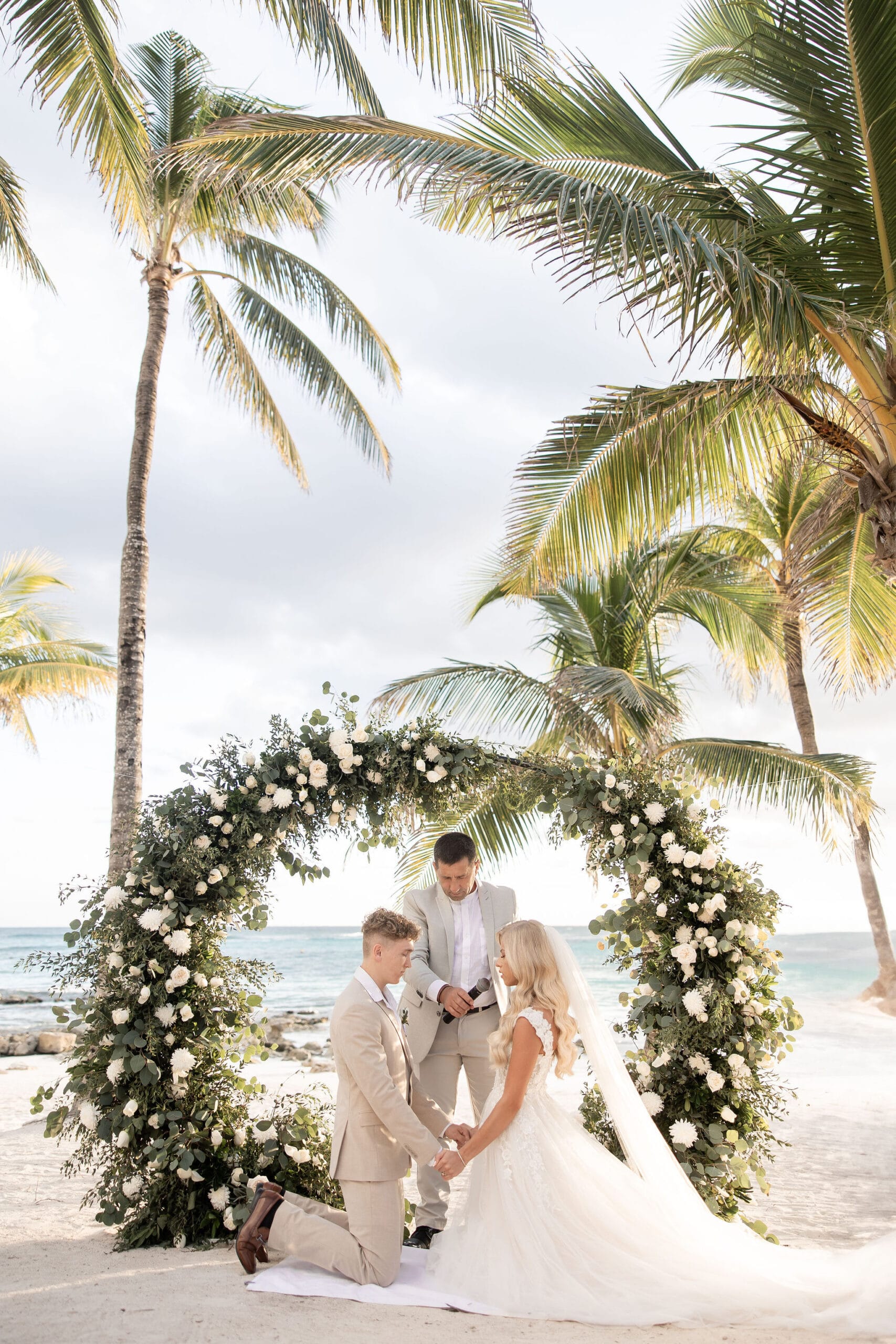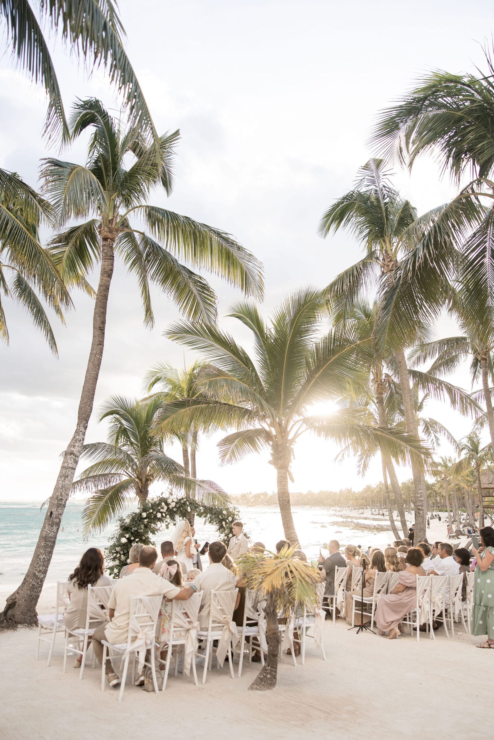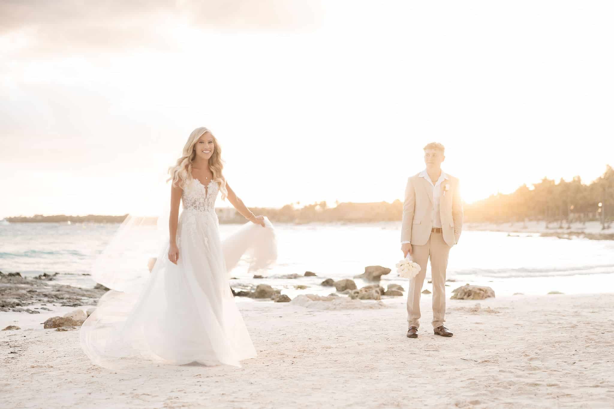 Deanna and Timothy’s wedding at Barceló Maya Palace was a breathtaking celebration set along the stunning Riviera Maya coastline. The couple exchanged vows under a romantic floral arch, with the turquoise waters of the Caribbean and swaying palm trees providing the perfect backdrop. Deanna, radiant in her lace gown and carrying a bouquet of pristine white roses, walked down the sandy aisle to meet Timothy, who was beaming with joy. The natural beauty of the beachfront setting, combined with elegant decor and the golden glow of the setting sun, created a truly magical atmosphere for their ceremony.