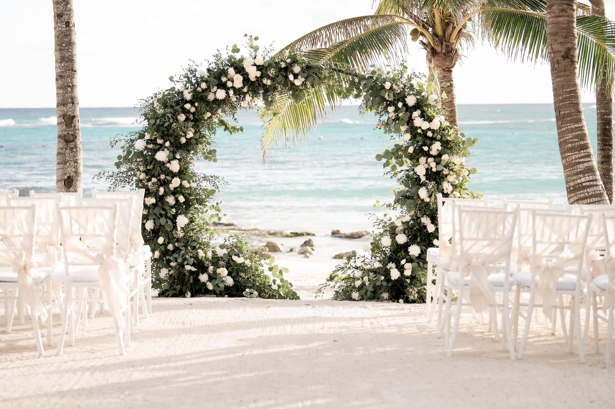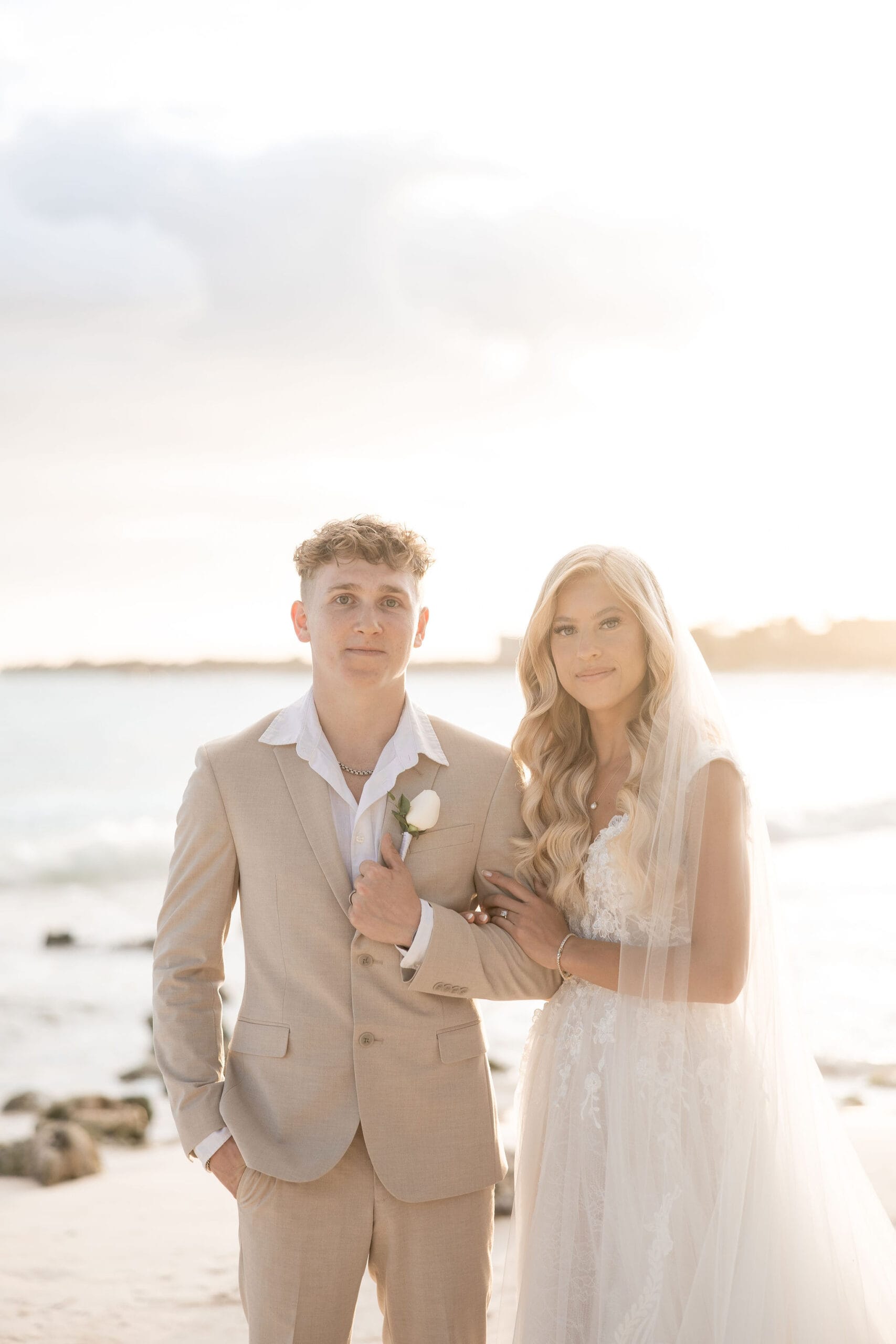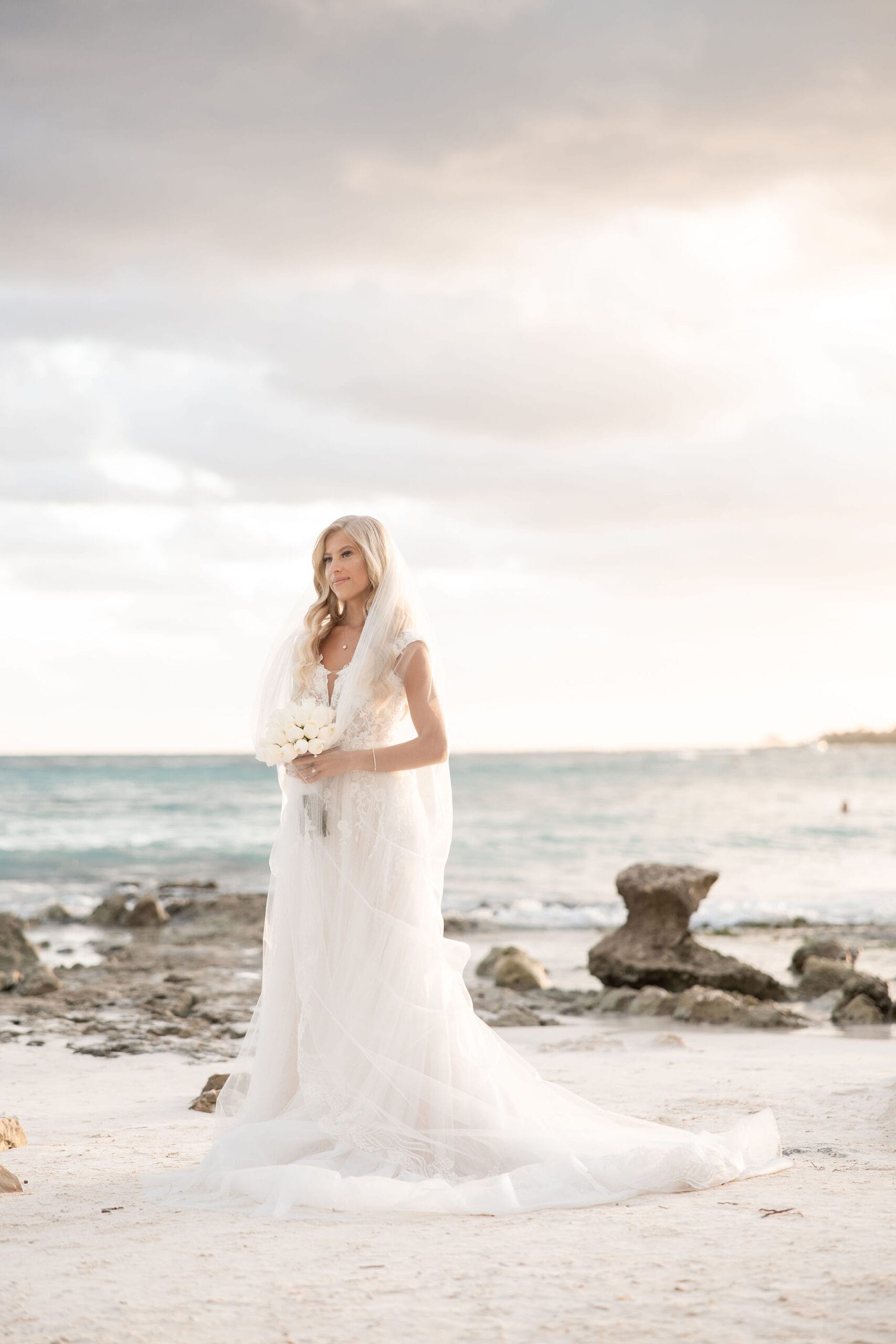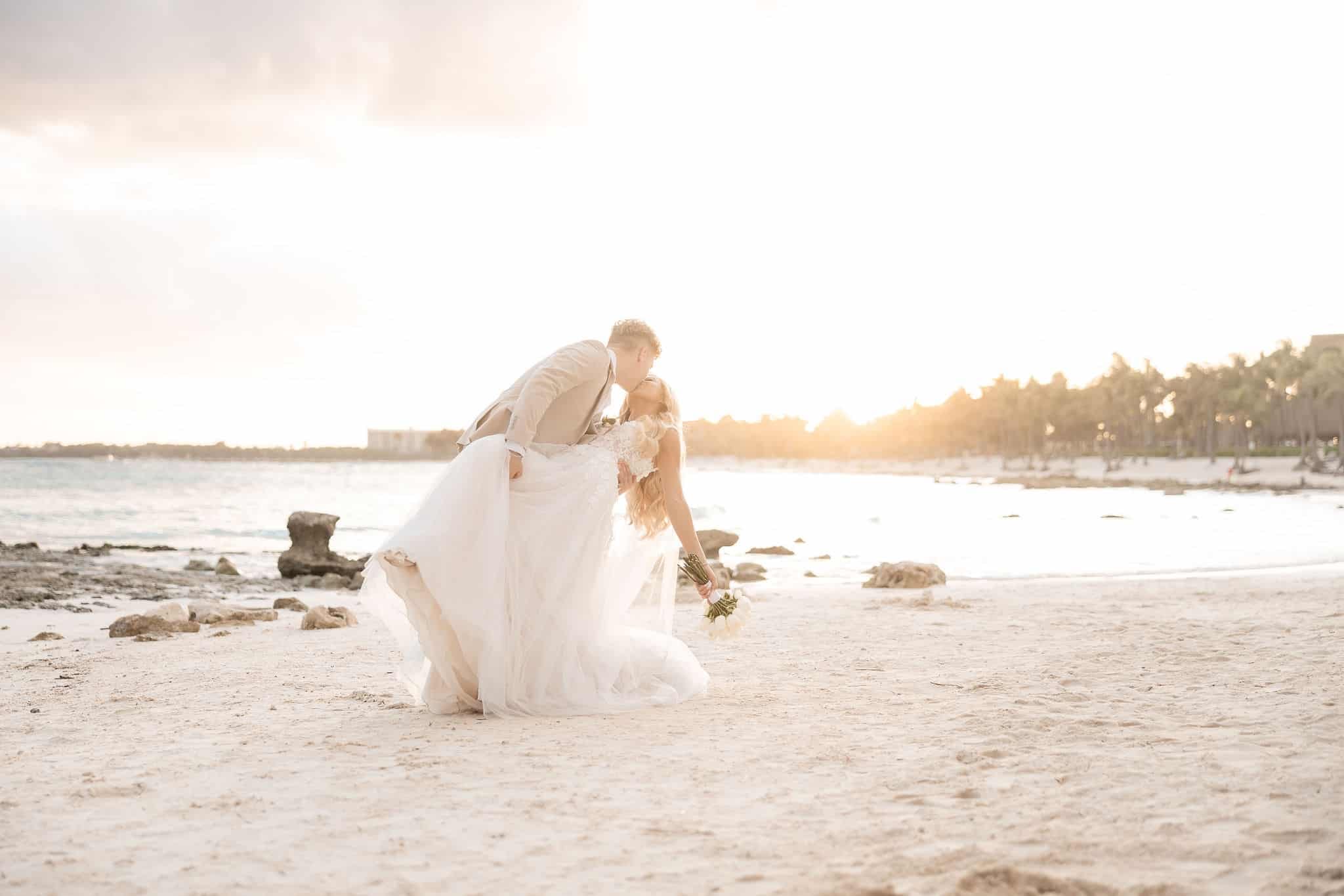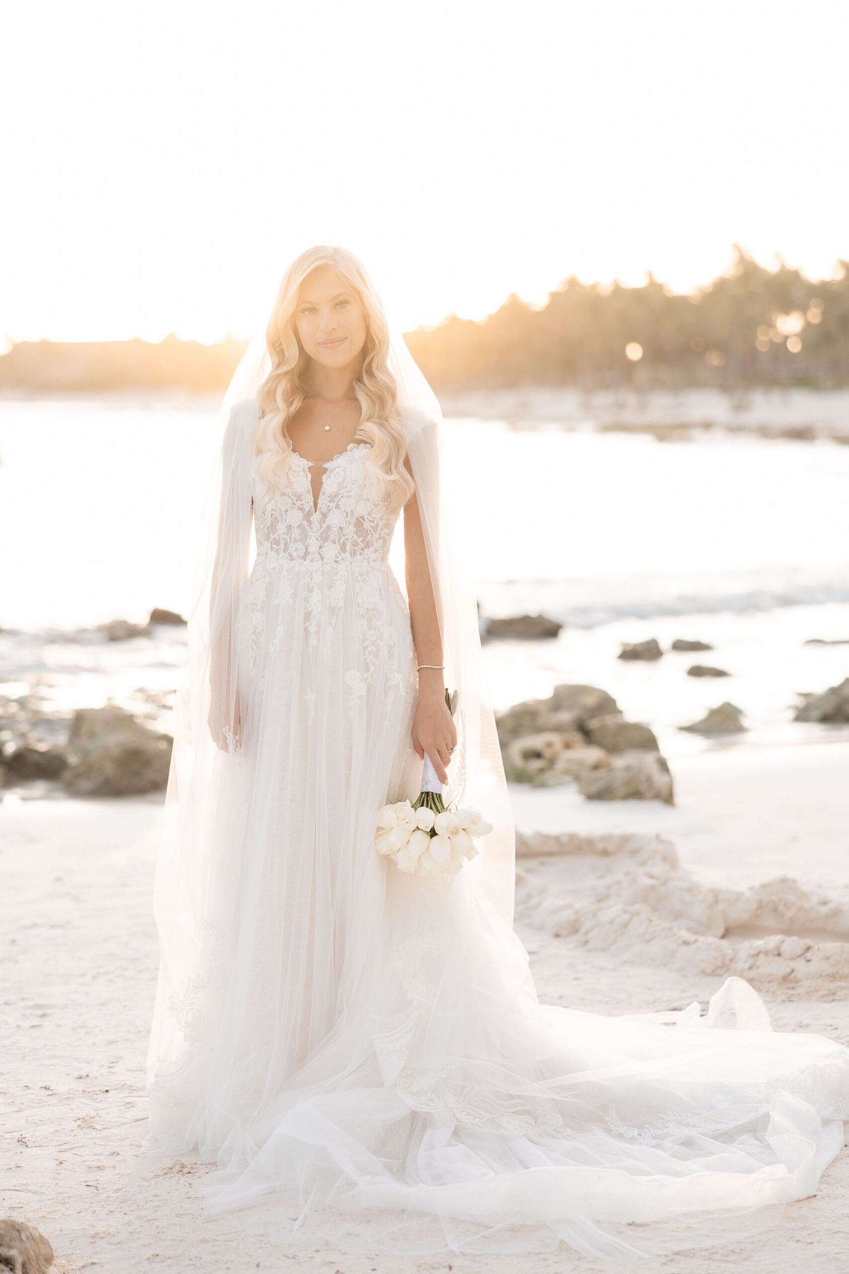 Deanna and Timothy’s wedding at Barceló Maya Palace was a breathtaking celebration set along the stunning Riviera Maya coastline. The couple exchanged vows under a romantic floral arch, with the turquoise waters of the Caribbean and swaying palm trees providing the perfect backdrop. Deanna, radiant in her lace gown and carrying a bouquet of pristine white roses, walked down the sandy aisle to meet Timothy, who was beaming with joy. The natural beauty of the beachfront setting, combined with elegant decor and the golden glow of the setting sun, created a truly magical atmosphere for their ceremony.