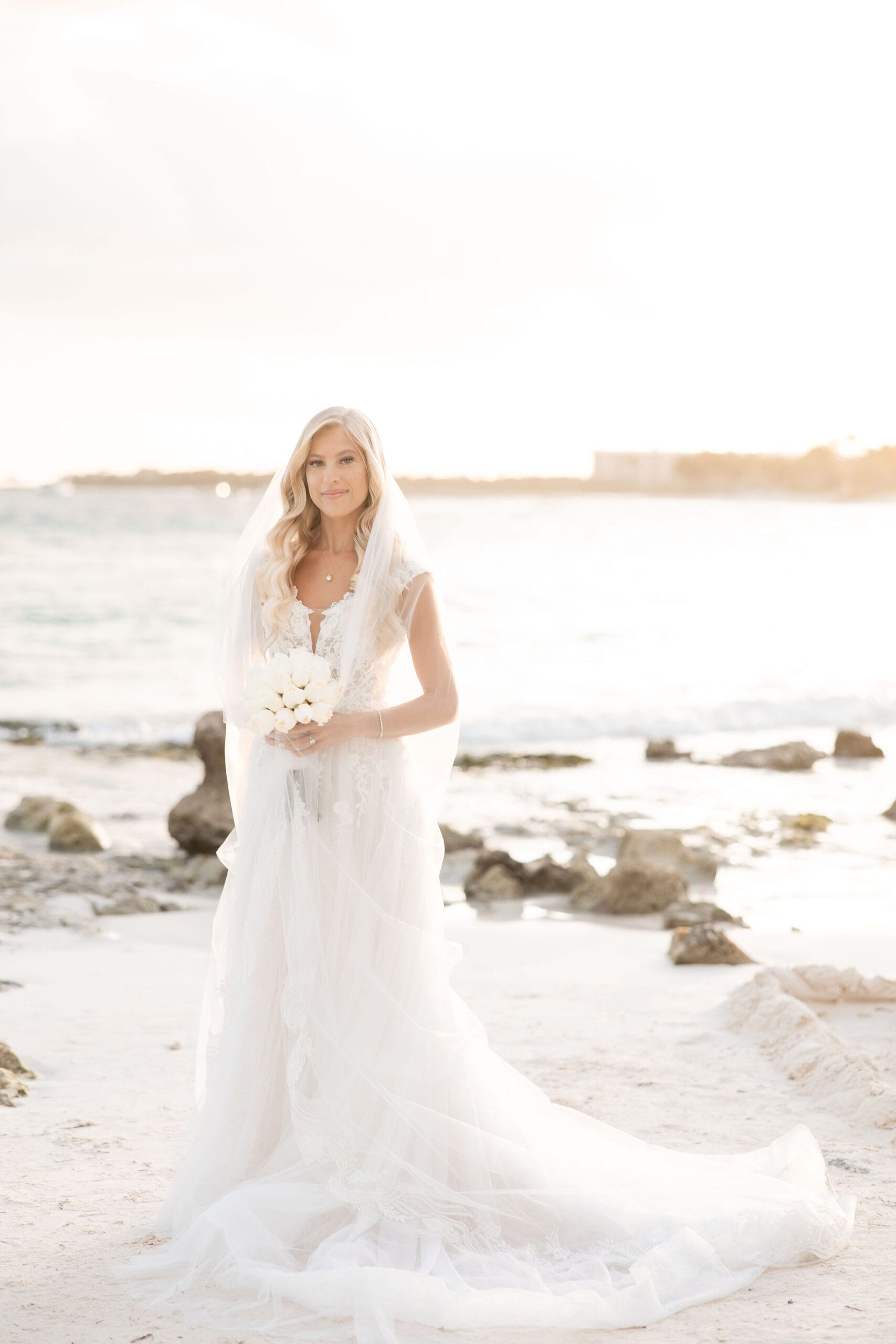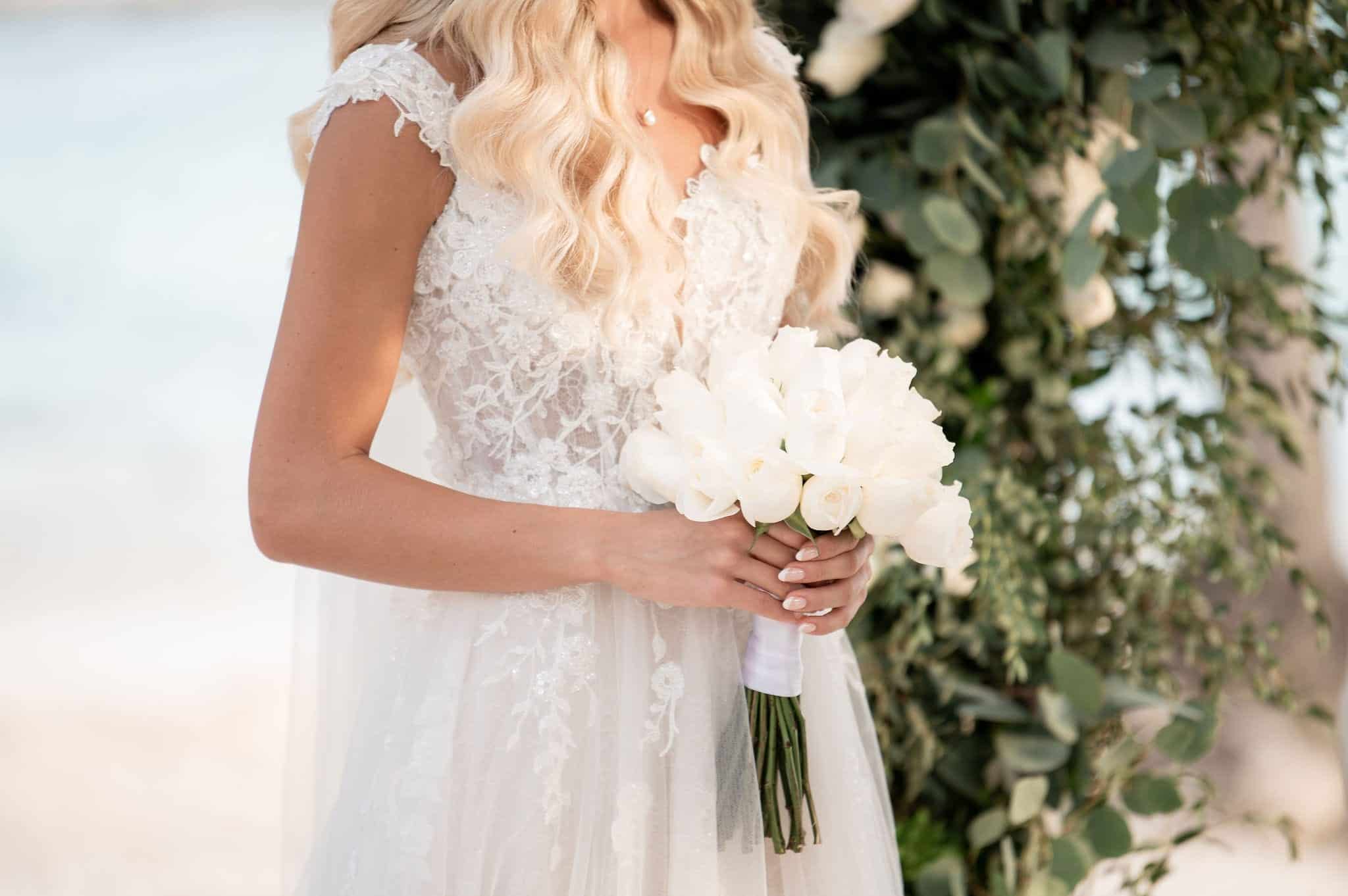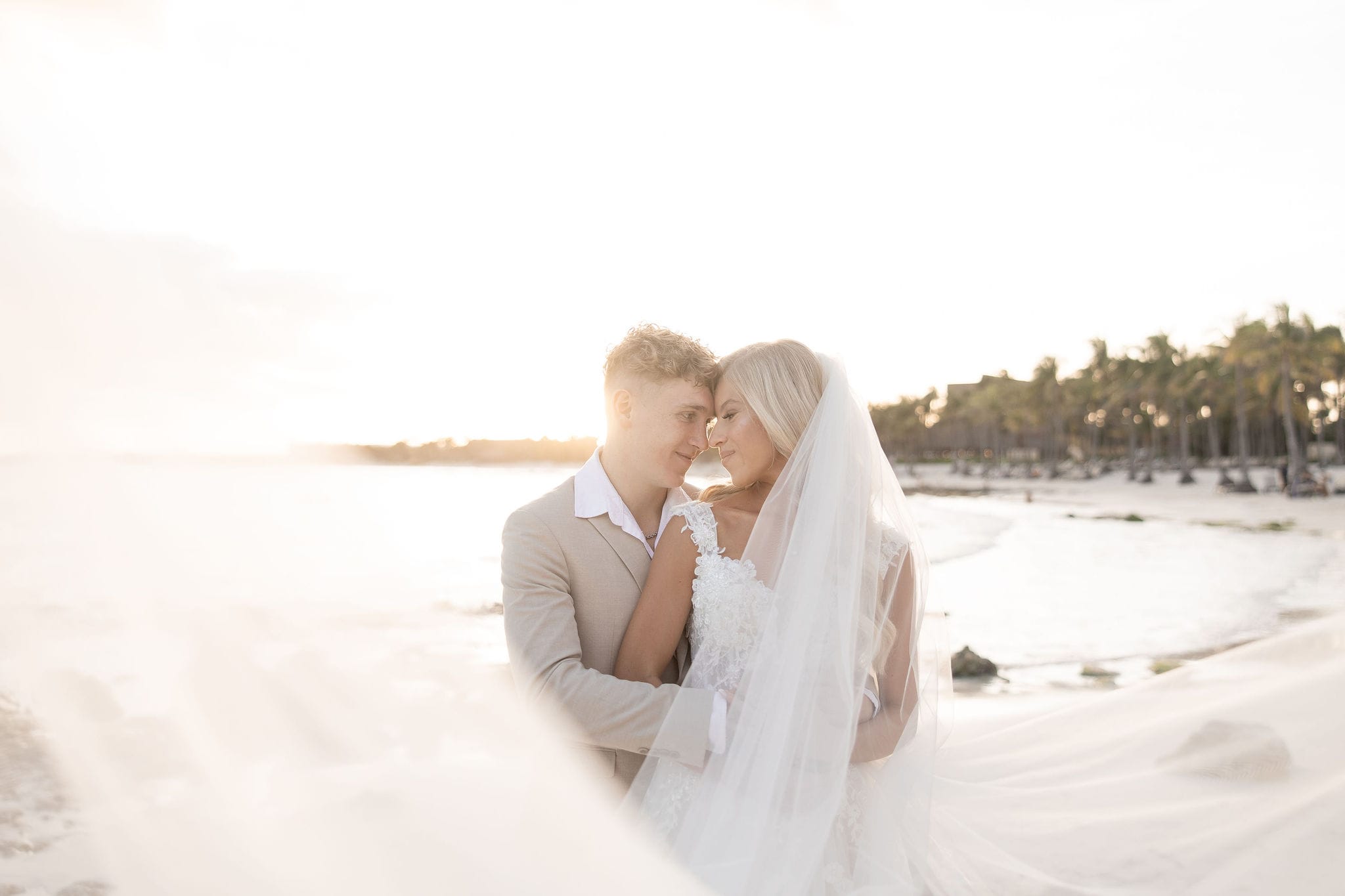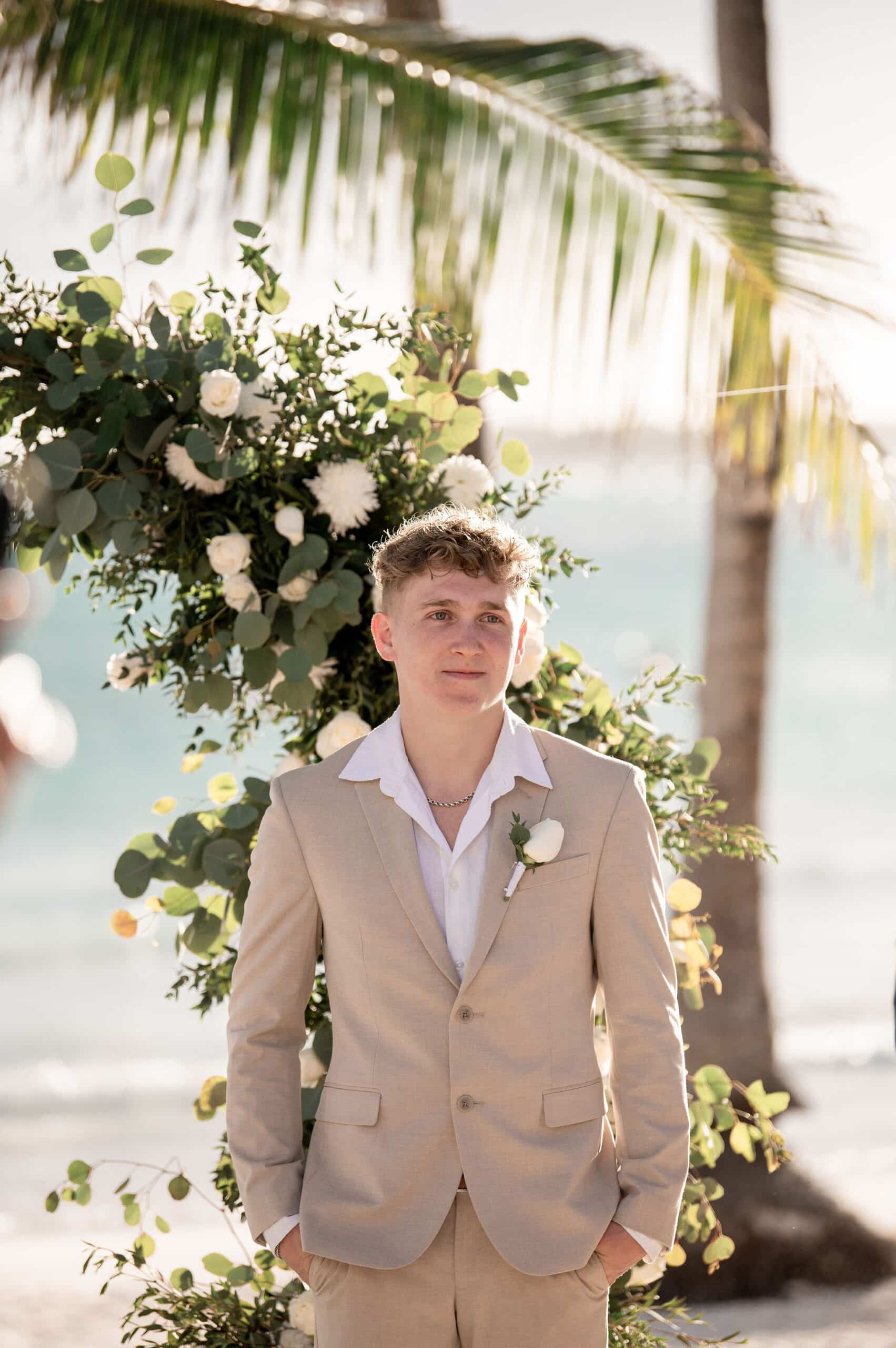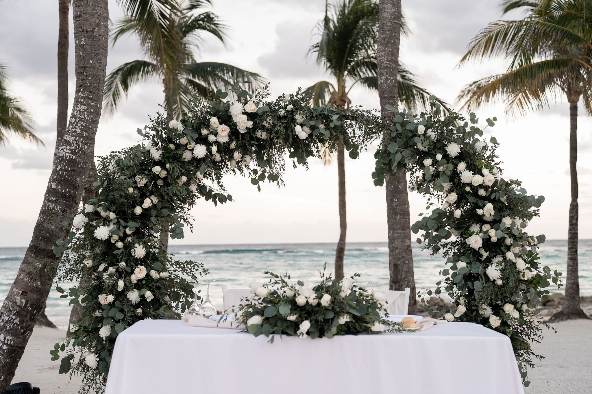 Deanna and Timothy’s wedding at Barceló Maya Palace was a breathtaking celebration set along the stunning Riviera Maya coastline. The couple exchanged vows under a romantic floral arch, with the turquoise waters of the Caribbean and swaying palm trees providing the perfect backdrop. Deanna, radiant in her lace gown and carrying a bouquet of pristine white roses, walked down the sandy aisle to meet Timothy, who was beaming with joy. The natural beauty of the beachfront setting, combined with elegant decor and the golden glow of the setting sun, created a truly magical atmosphere for their ceremony.