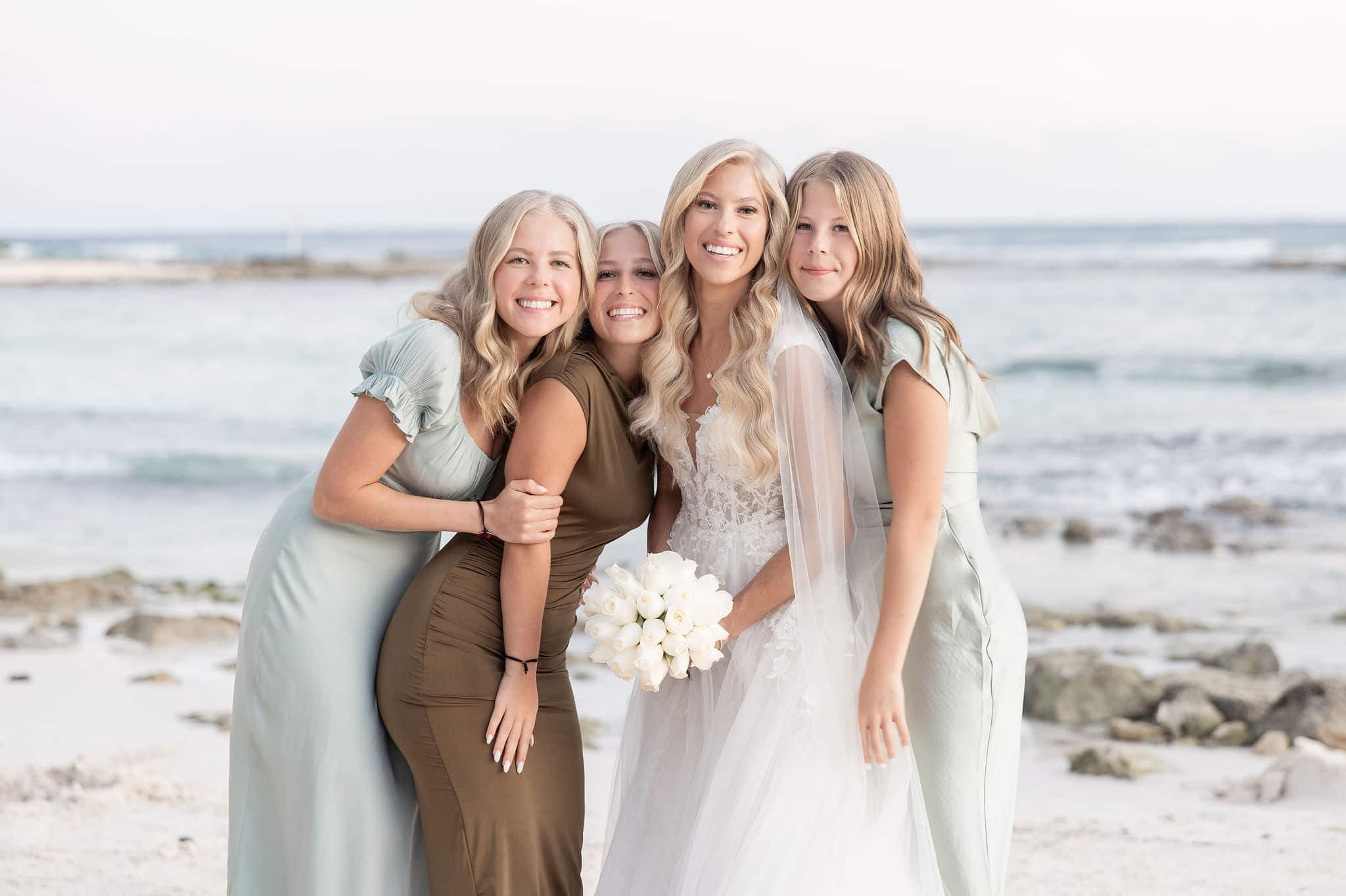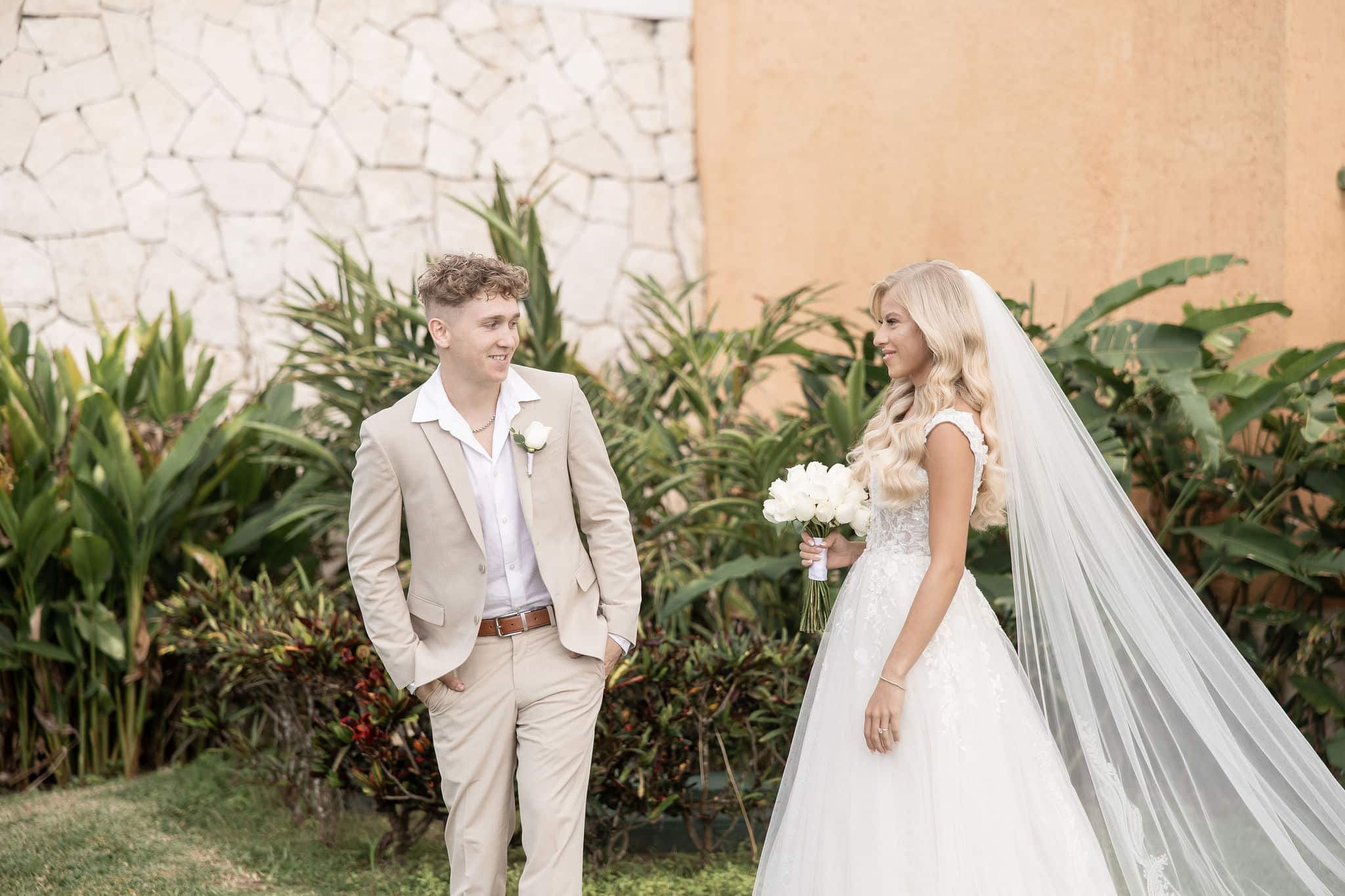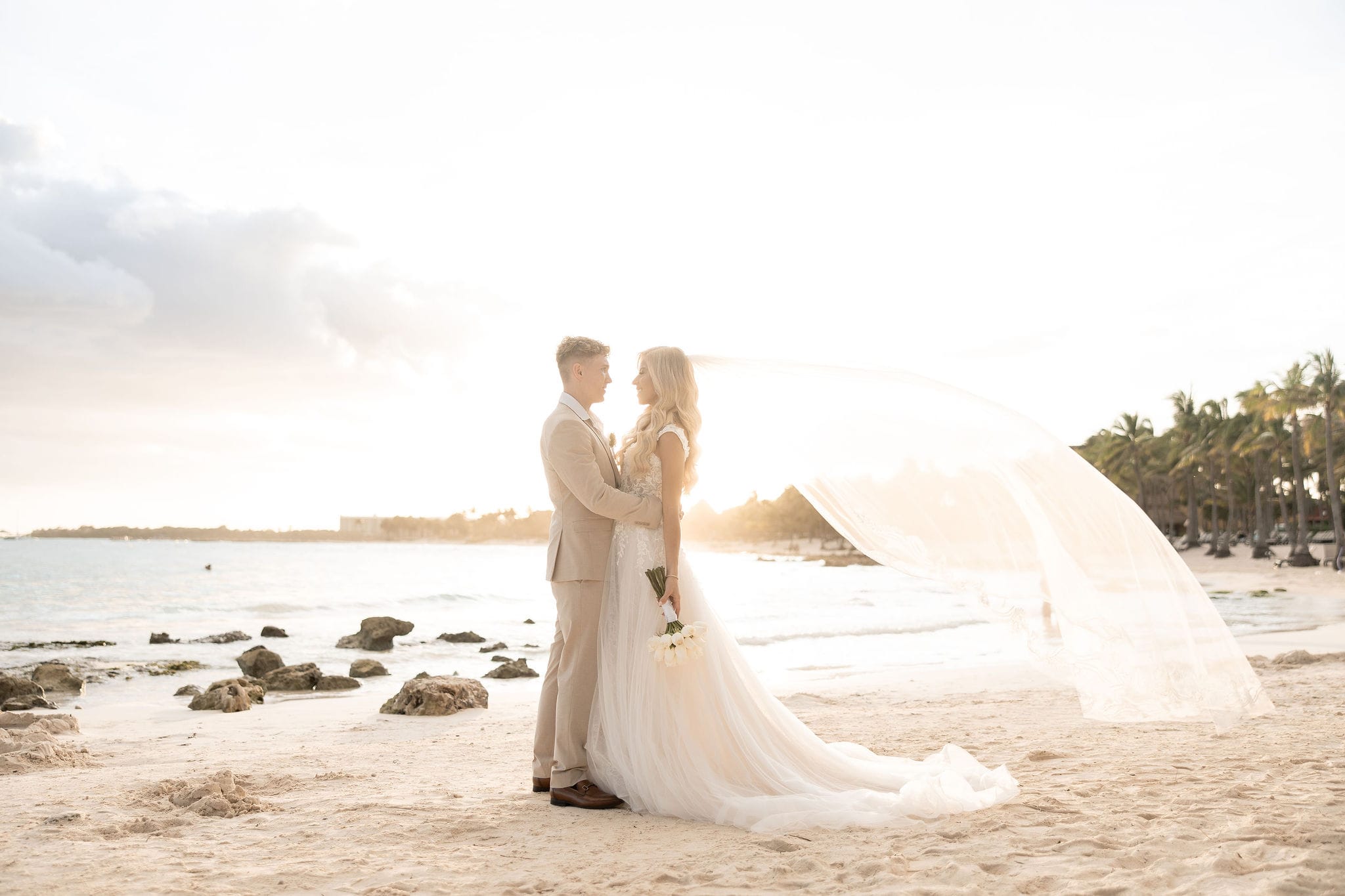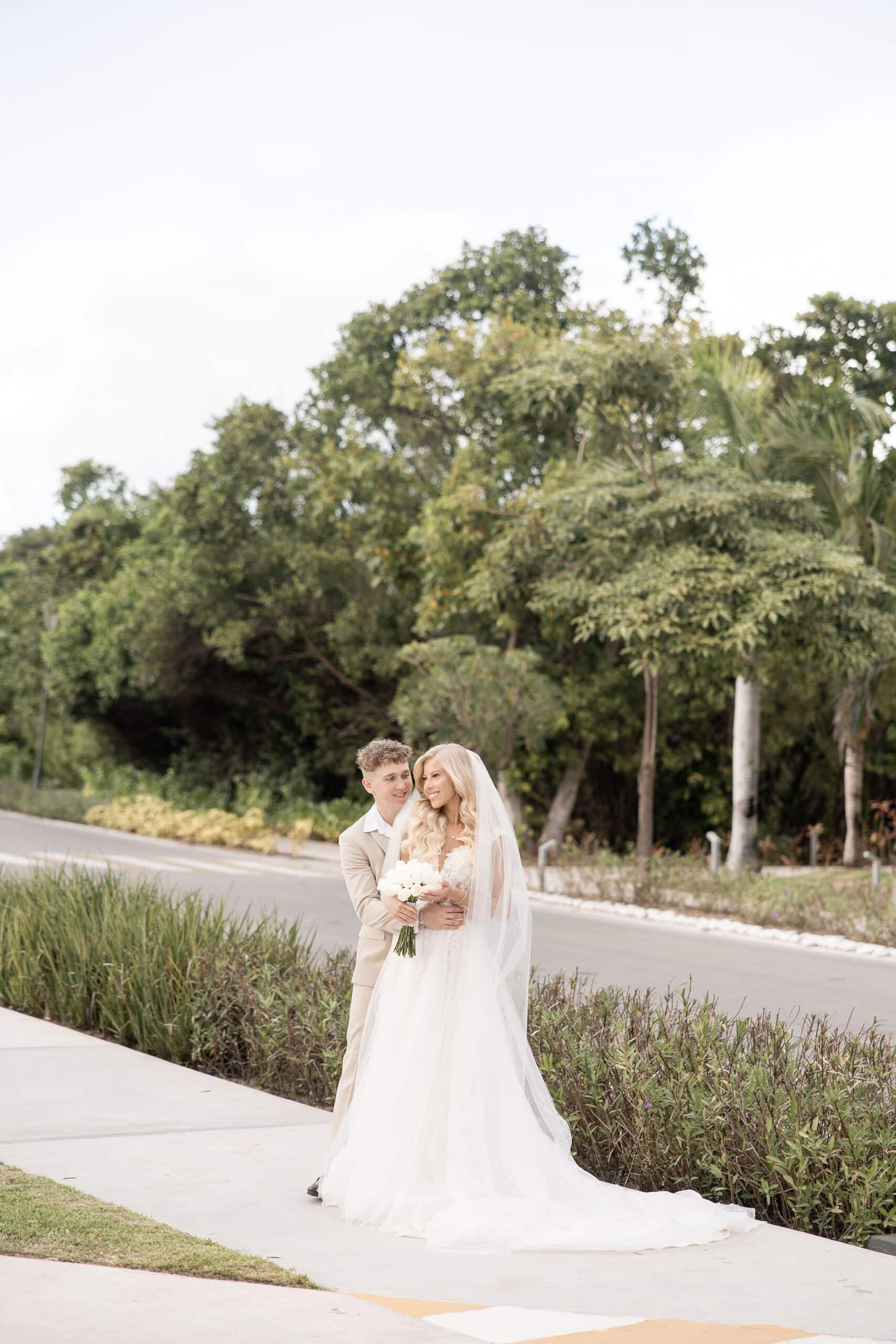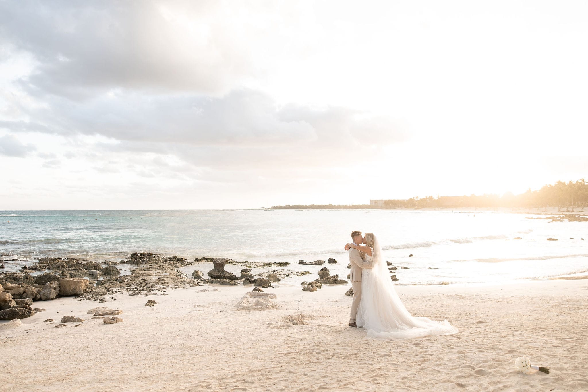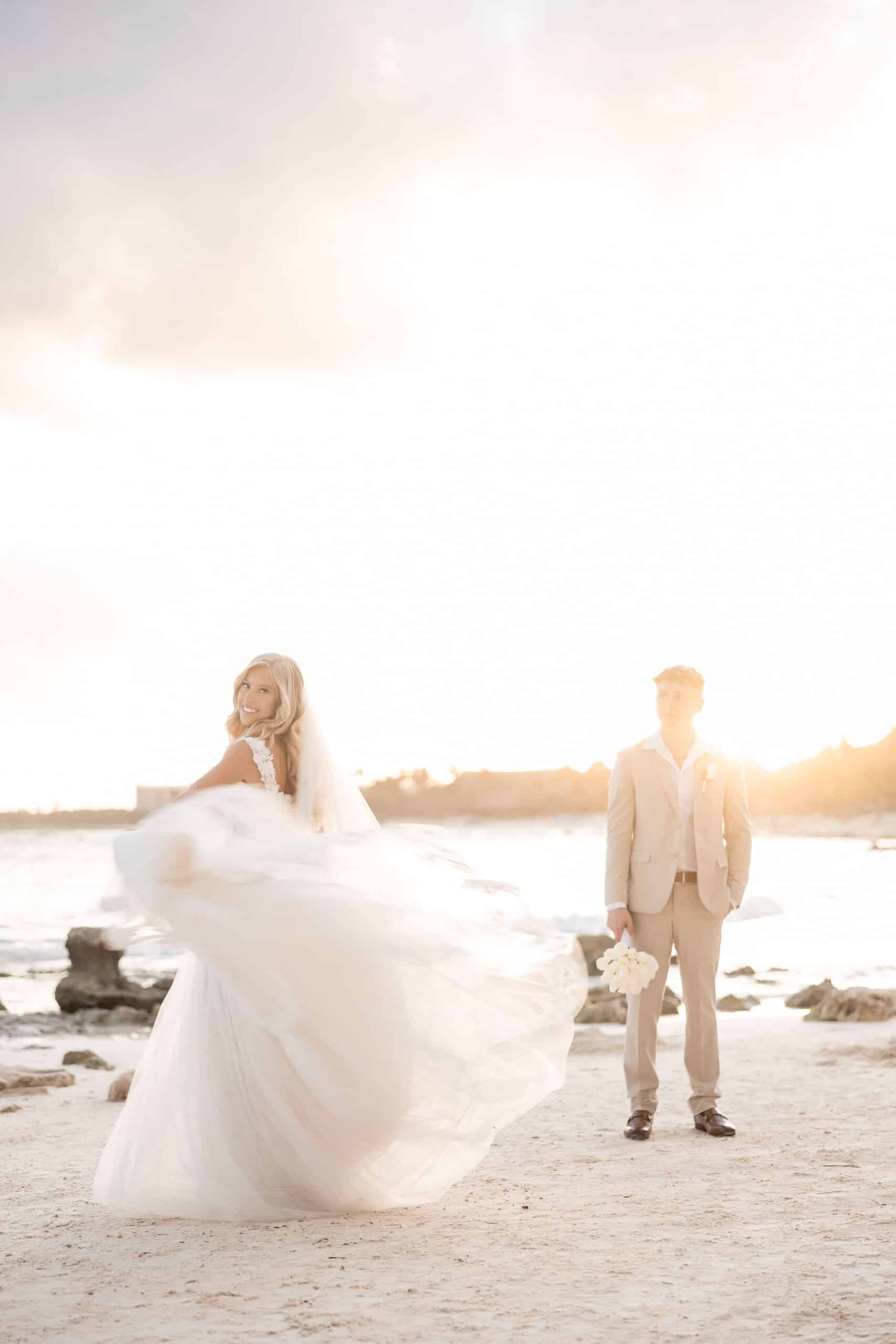 Deanna and Timothy’s wedding at Barceló Maya Palace was a breathtaking celebration set along the stunning Riviera Maya coastline. The couple exchanged vows under a romantic floral arch, with the turquoise waters of the Caribbean and swaying palm trees providing the perfect backdrop. Deanna, radiant in her lace gown and carrying a bouquet of pristine white roses, walked down the sandy aisle to meet Timothy, who was beaming with joy. The natural beauty of the beachfront setting, combined with elegant decor and the golden glow of the setting sun, created a truly magical atmosphere for their ceremony.