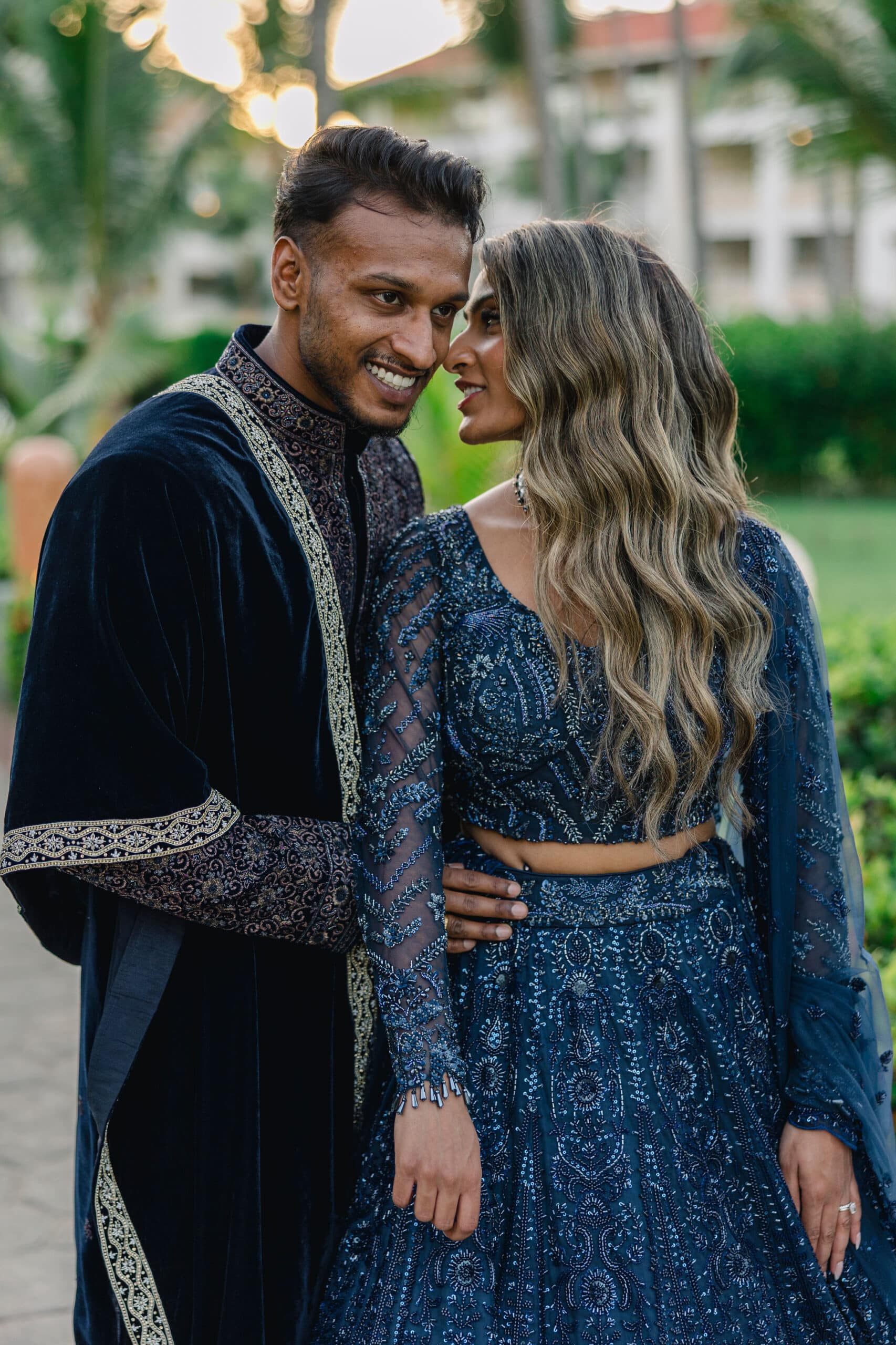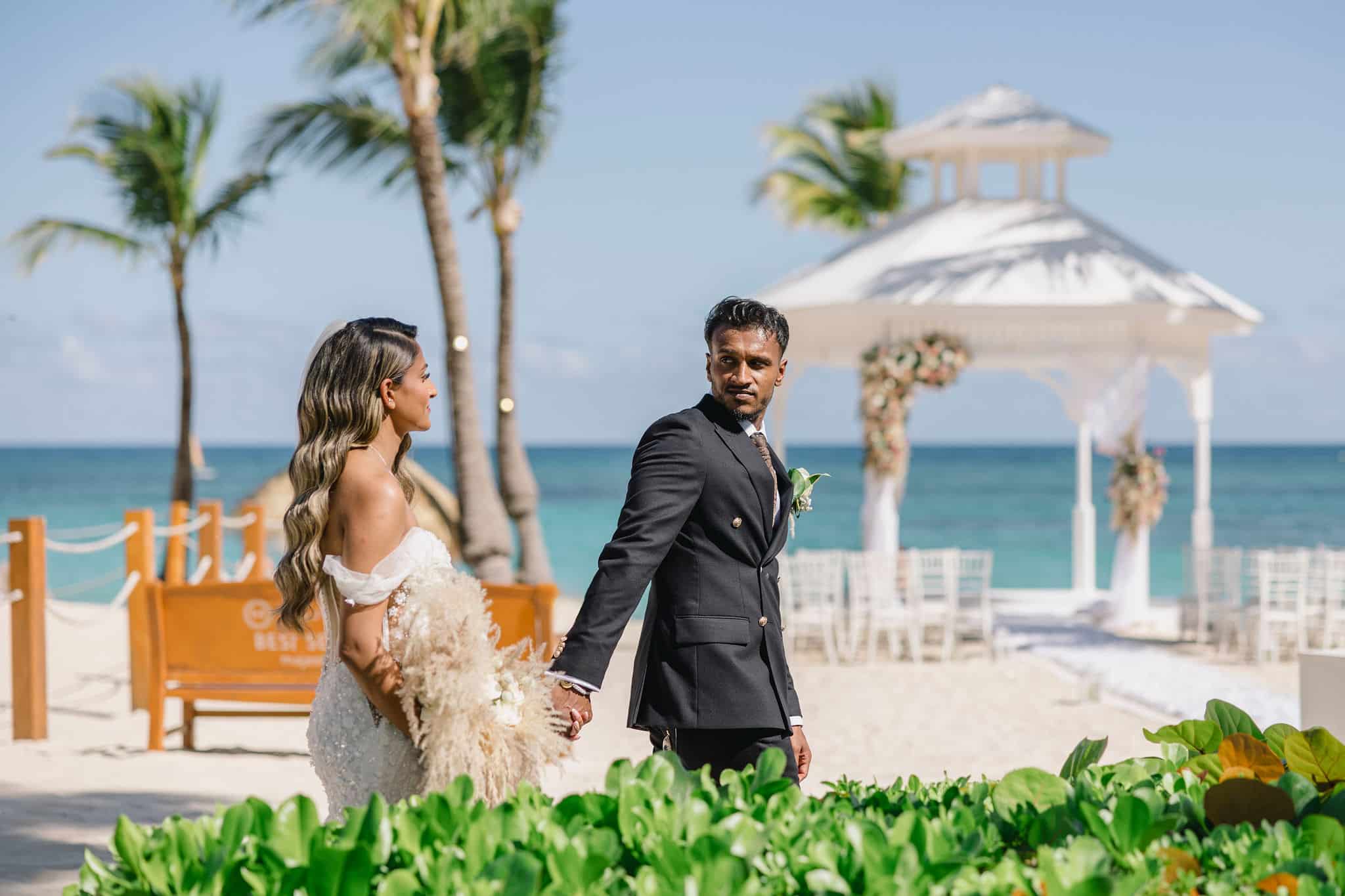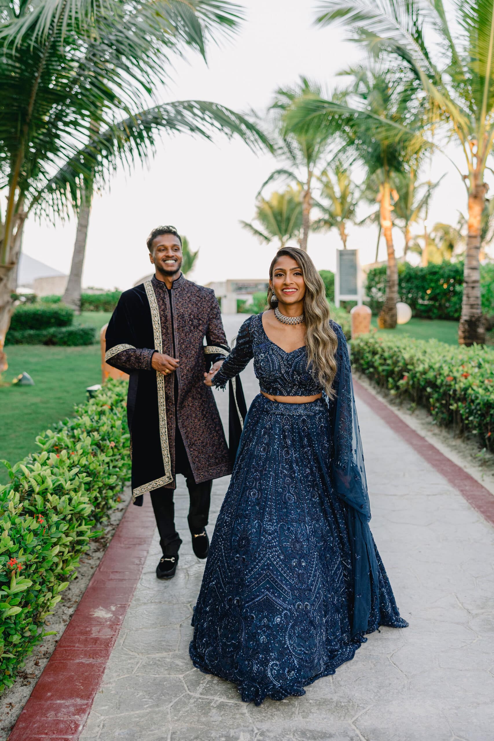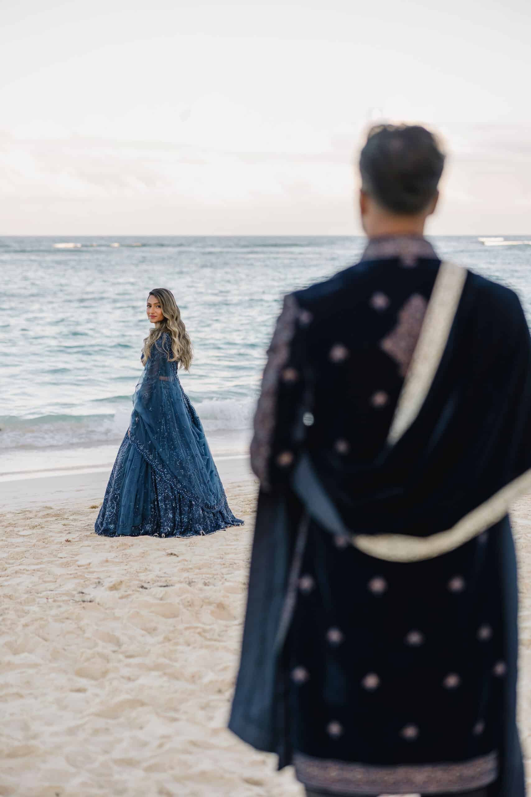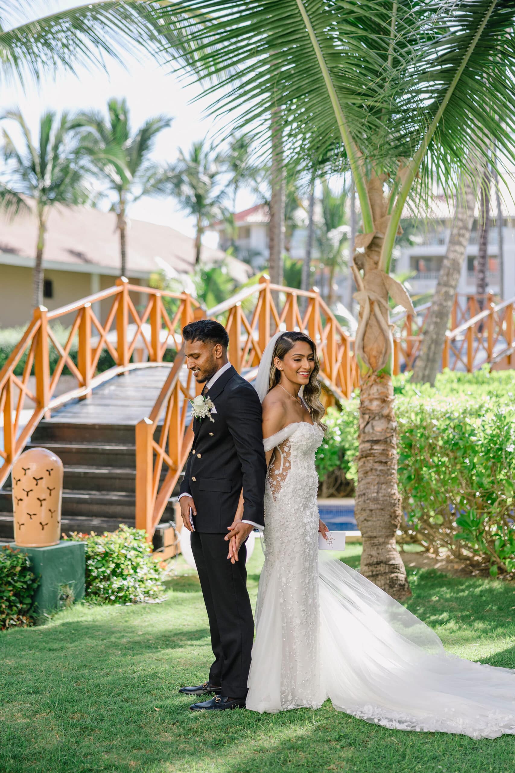 Hanshika and Kajalakshan’s wedding at Majestic Mirage Punta Cana was a breathtaking fusion of elegance, culture, and emotion, set against the stunning backdrop of the Caribbean. Their celebration began with an intimate and deeply emotional first look, where the couple stood back-to-back, holding hands before seeing each other. That quiet moment, filled with anticipation and love, perfectly captured the essence of their connection. Surrounded by lush tropical greenery and soft natural light, Hanshika looked radiant in her intricately detailed gown, while Kajalakshan’s classic look complemented the timeless feel of the moment. It was a beautiful beginning to a day that would unfold with both grace and vibrancy.