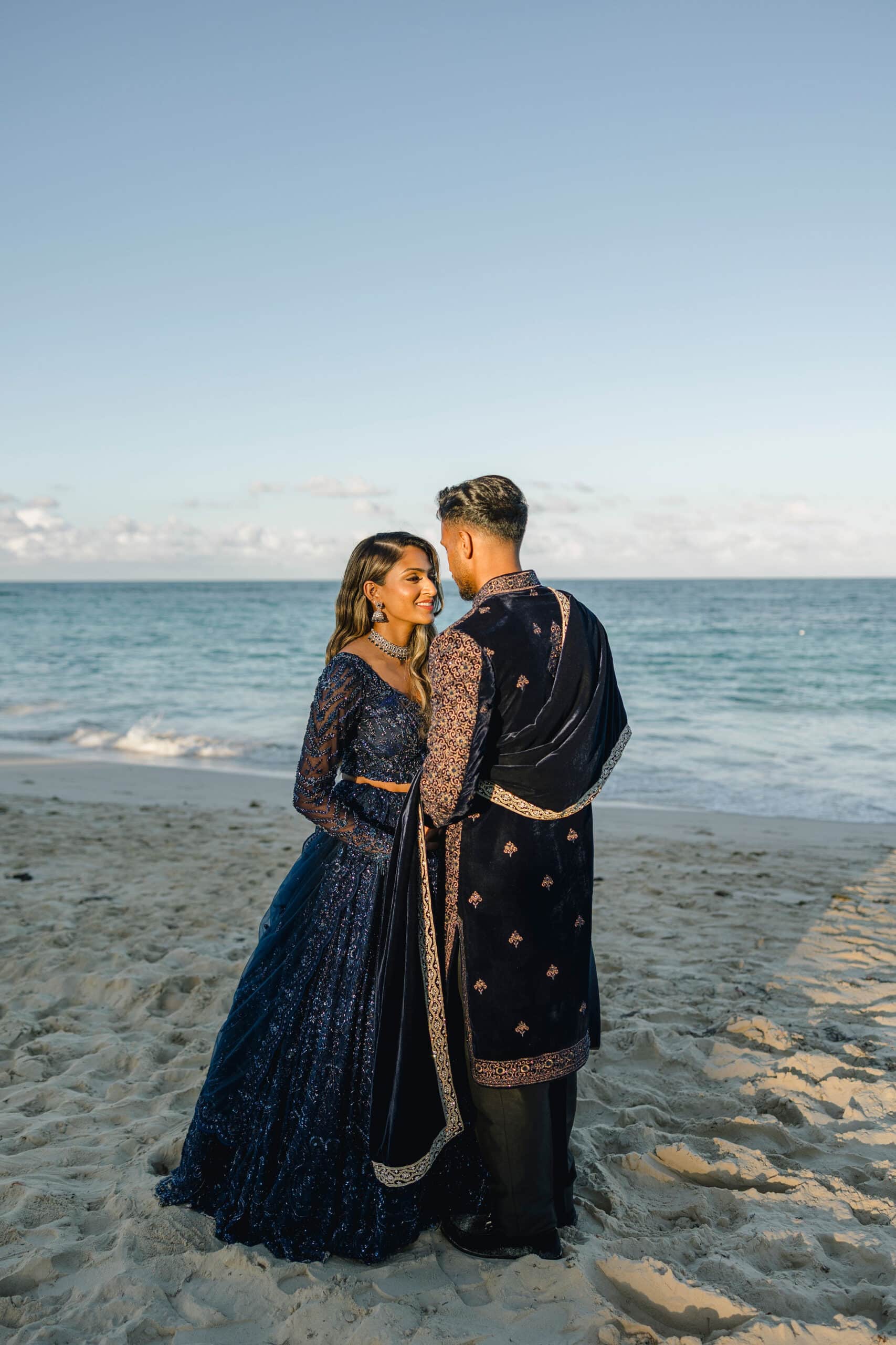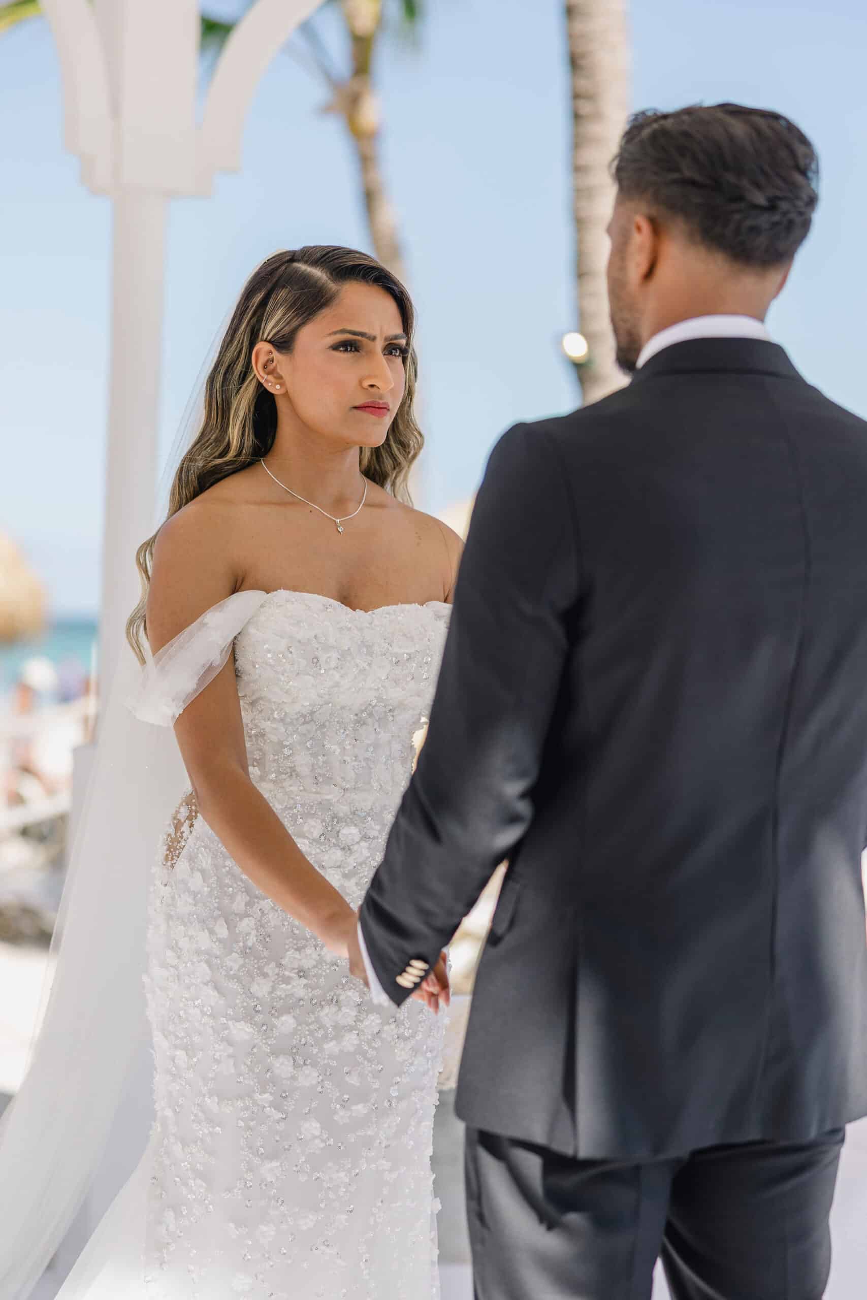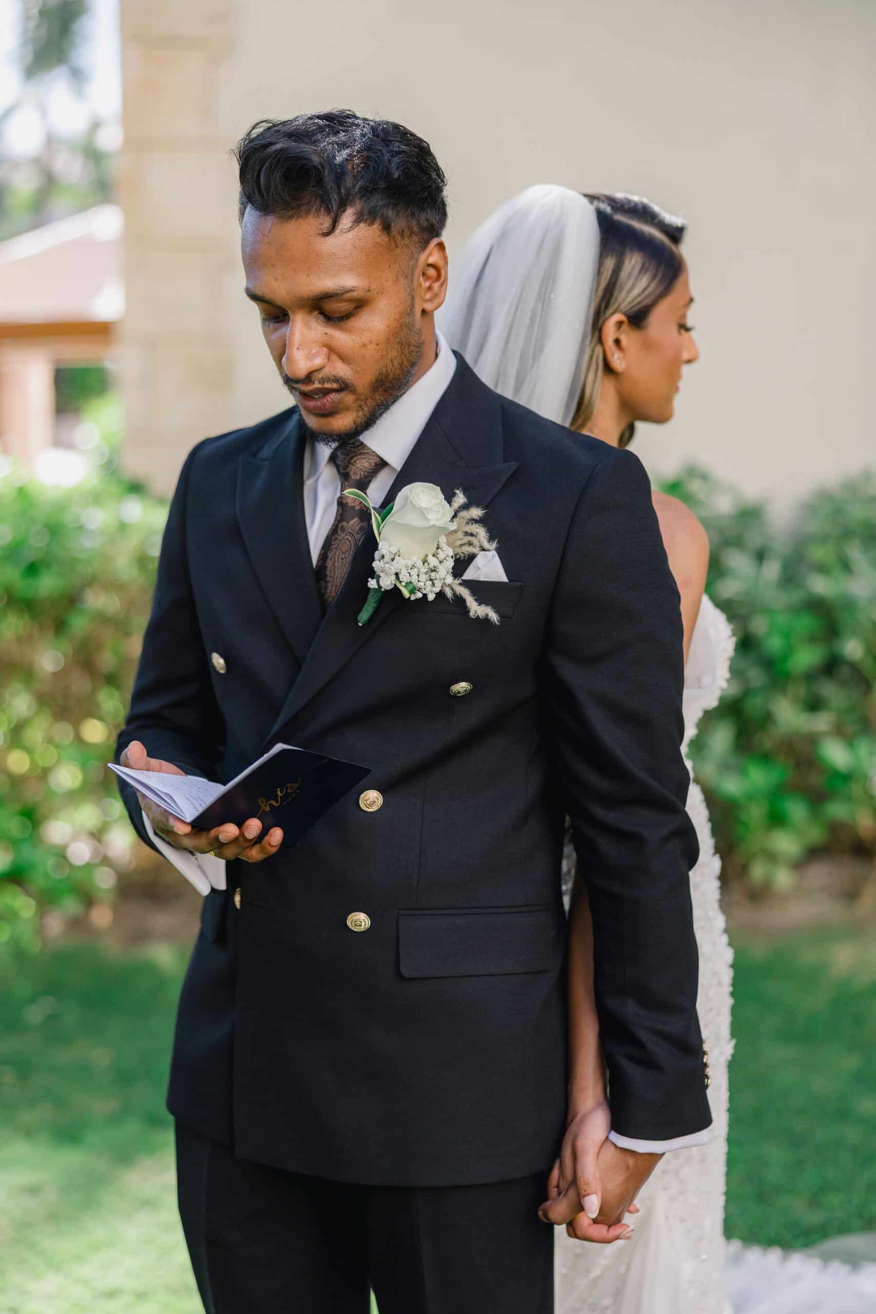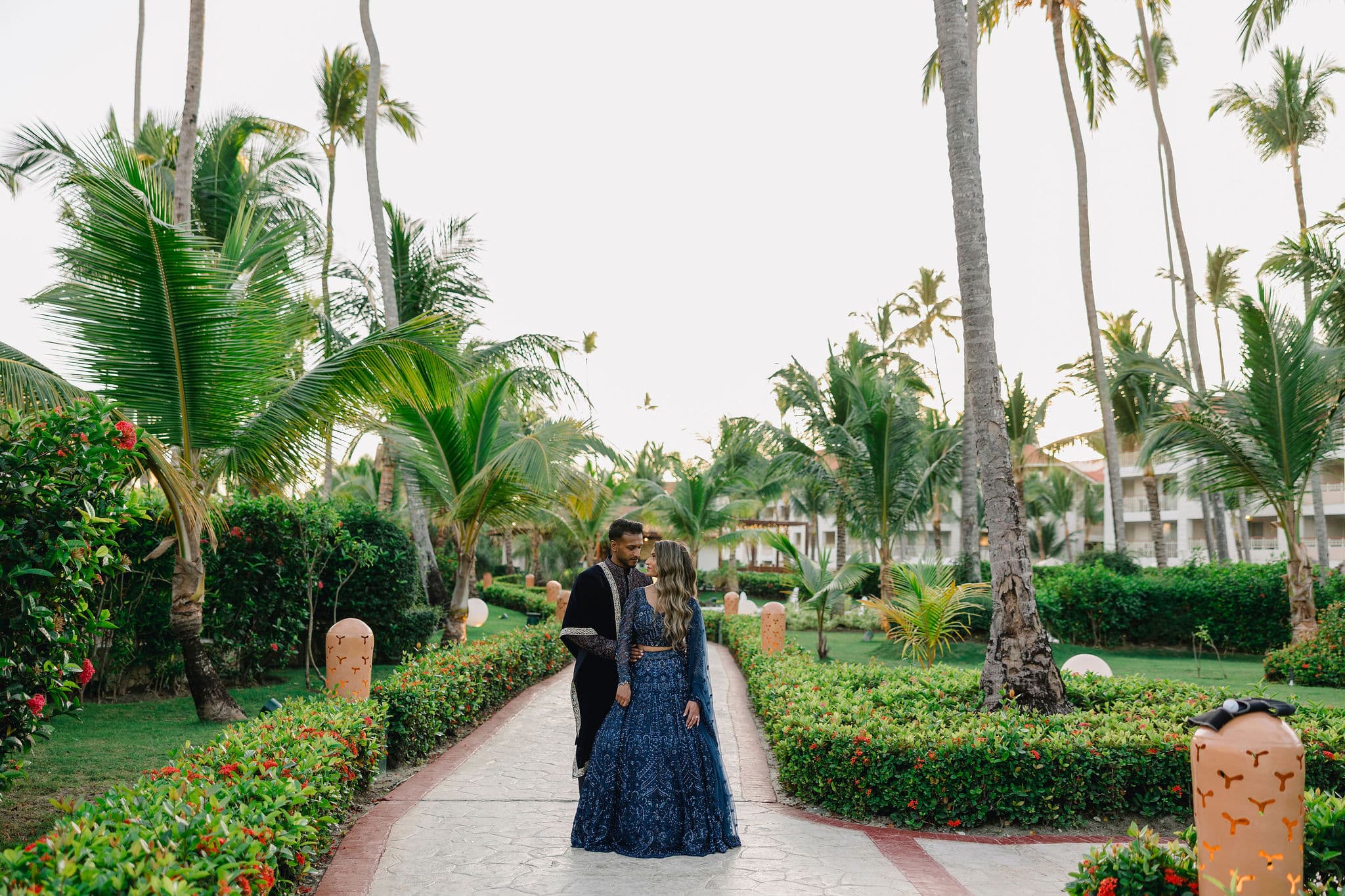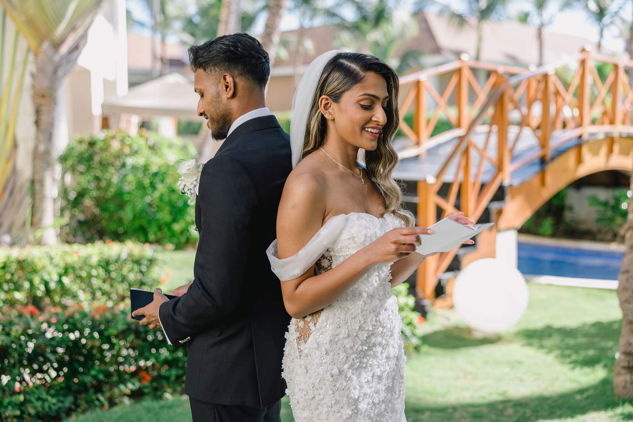 Hanshika and Kajalakshan’s wedding at Majestic Mirage Punta Cana was a breathtaking fusion of elegance, culture, and emotion, set against the stunning backdrop of the Caribbean. Their celebration began with an intimate and deeply emotional first look, where the couple stood back-to-back, holding hands before seeing each other. That quiet moment, filled with anticipation and love, perfectly captured the essence of their connection. Surrounded by lush tropical greenery and soft natural light, Hanshika looked radiant in her intricately detailed gown, while Kajalakshan’s classic look complemented the timeless feel of the moment. It was a beautiful beginning to a day that would unfold with both grace and vibrancy.
