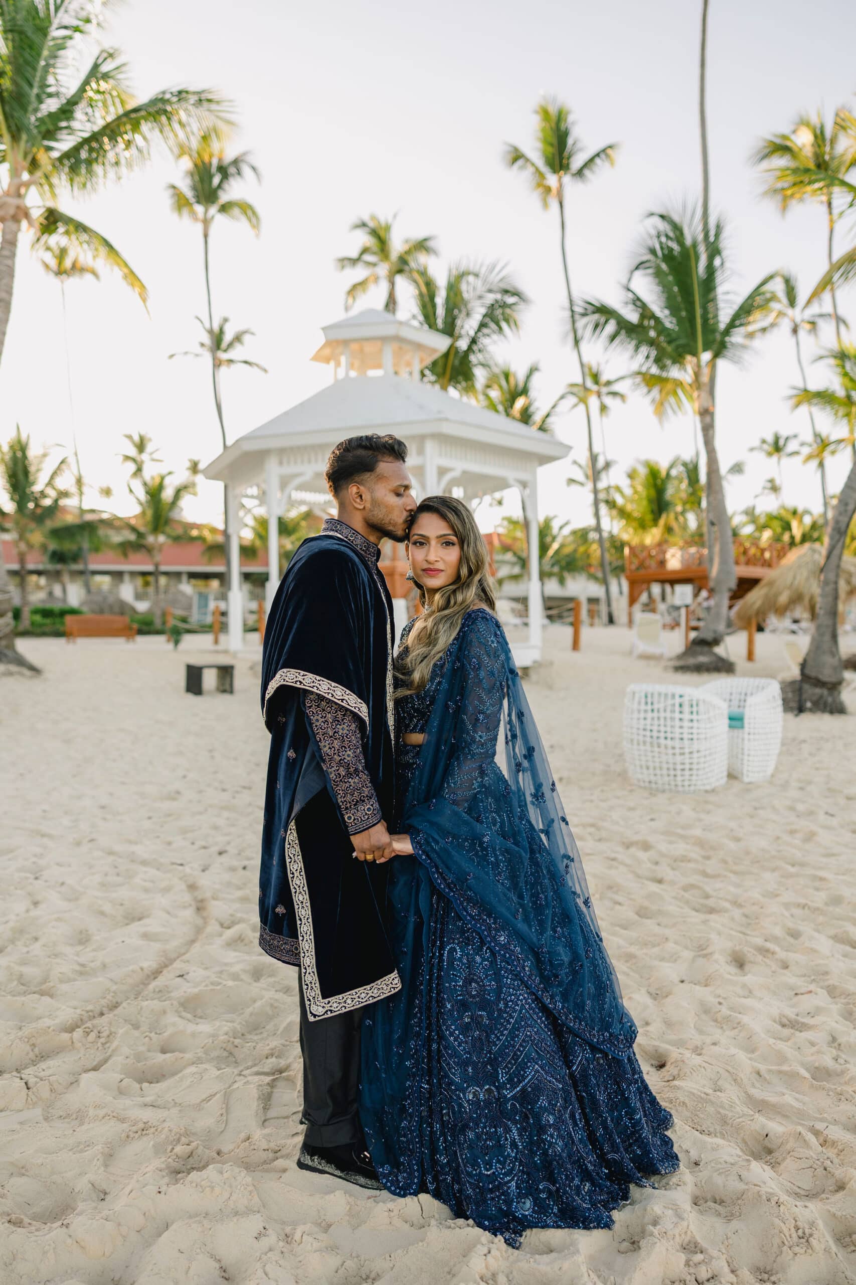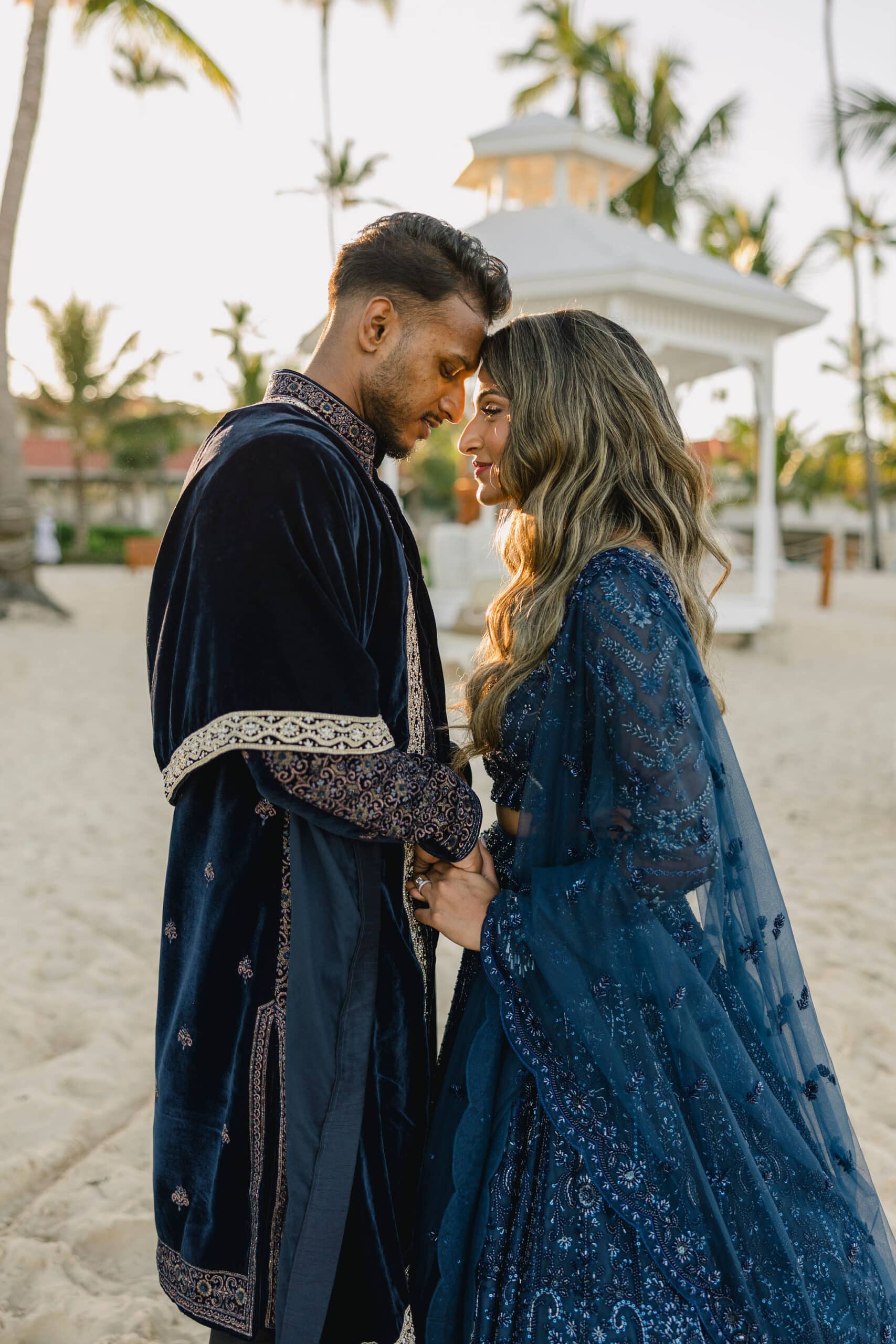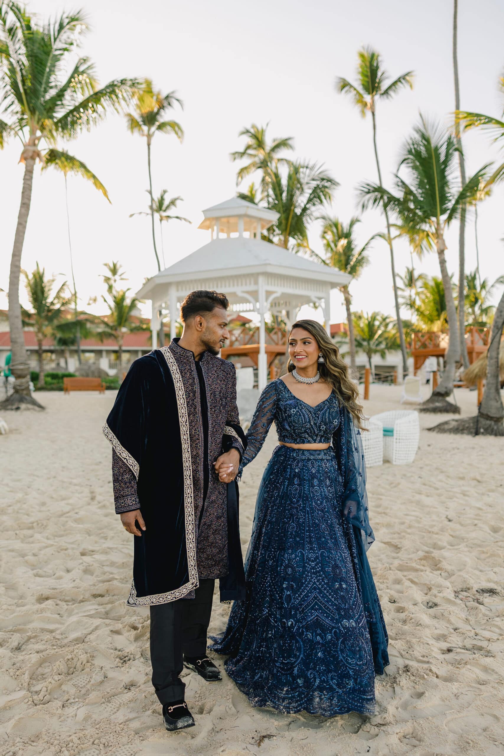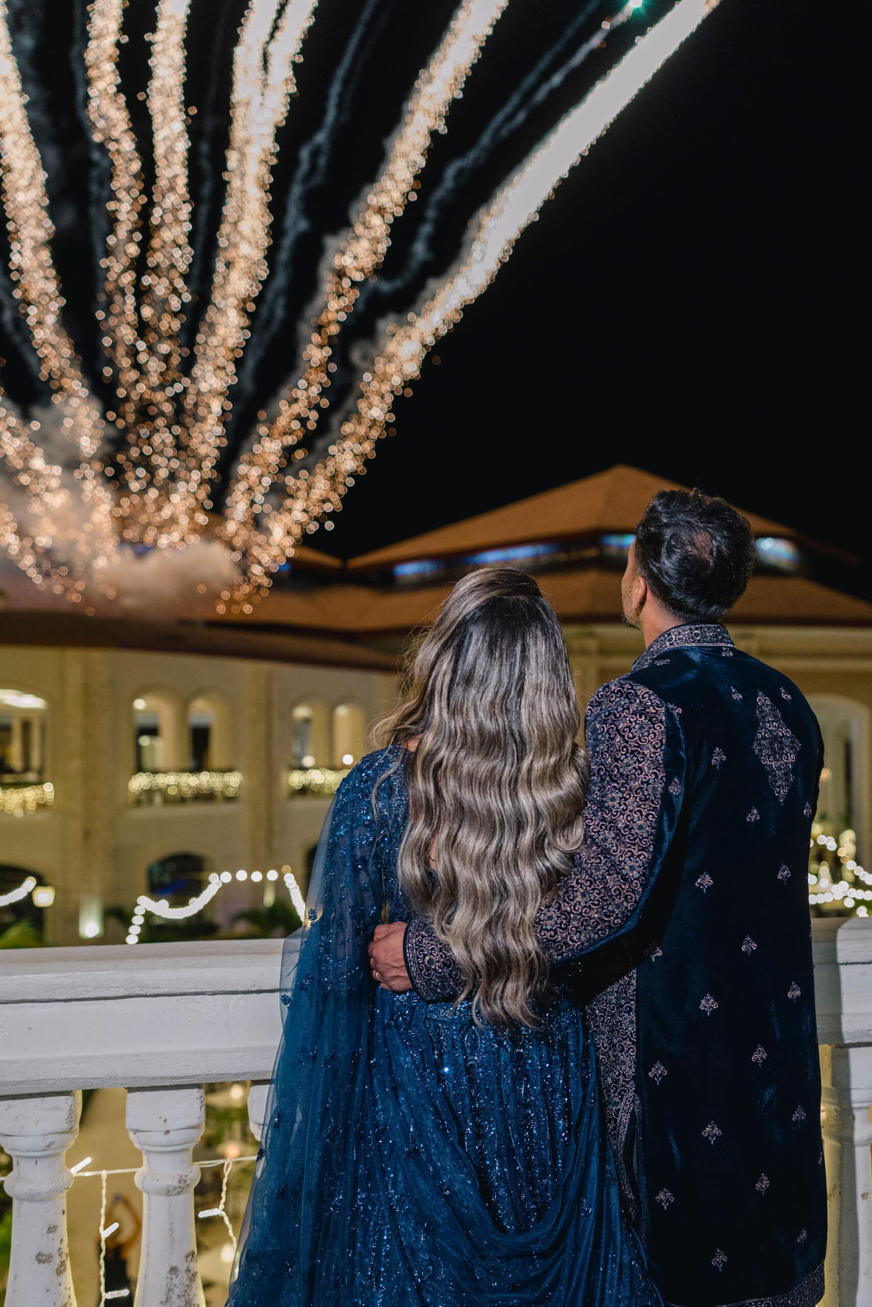 As the day transitioned into evening, the celebration took on a more intimate and romantic tone. Dressed in elegant traditional attire, Hanshika and Kajalakshan embraced their cultural roots, sharing quiet, heartfelt moments along the beach at sunset. Later, under the night sky, they stood together overlooking the glowing lights of the resort as fireworks lit up the darkness, symbolizing the beginning of their new journey together. Every part of their wedding—from the serene morning moments to the vibrant ceremony and magical night—told a story of love, unity, and beauty, making their wedding at Majestic Mirage Punta Cana truly unforgettable.