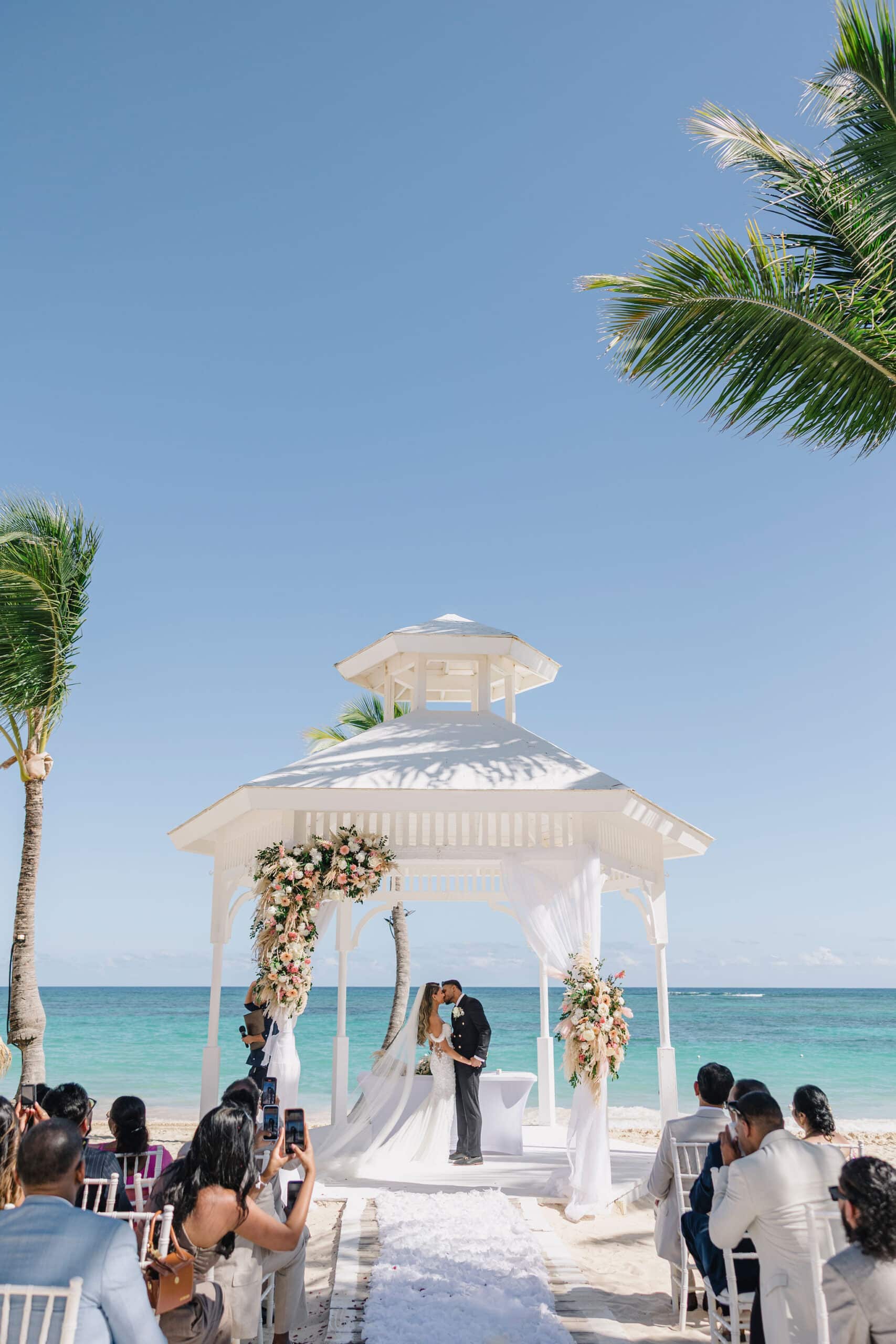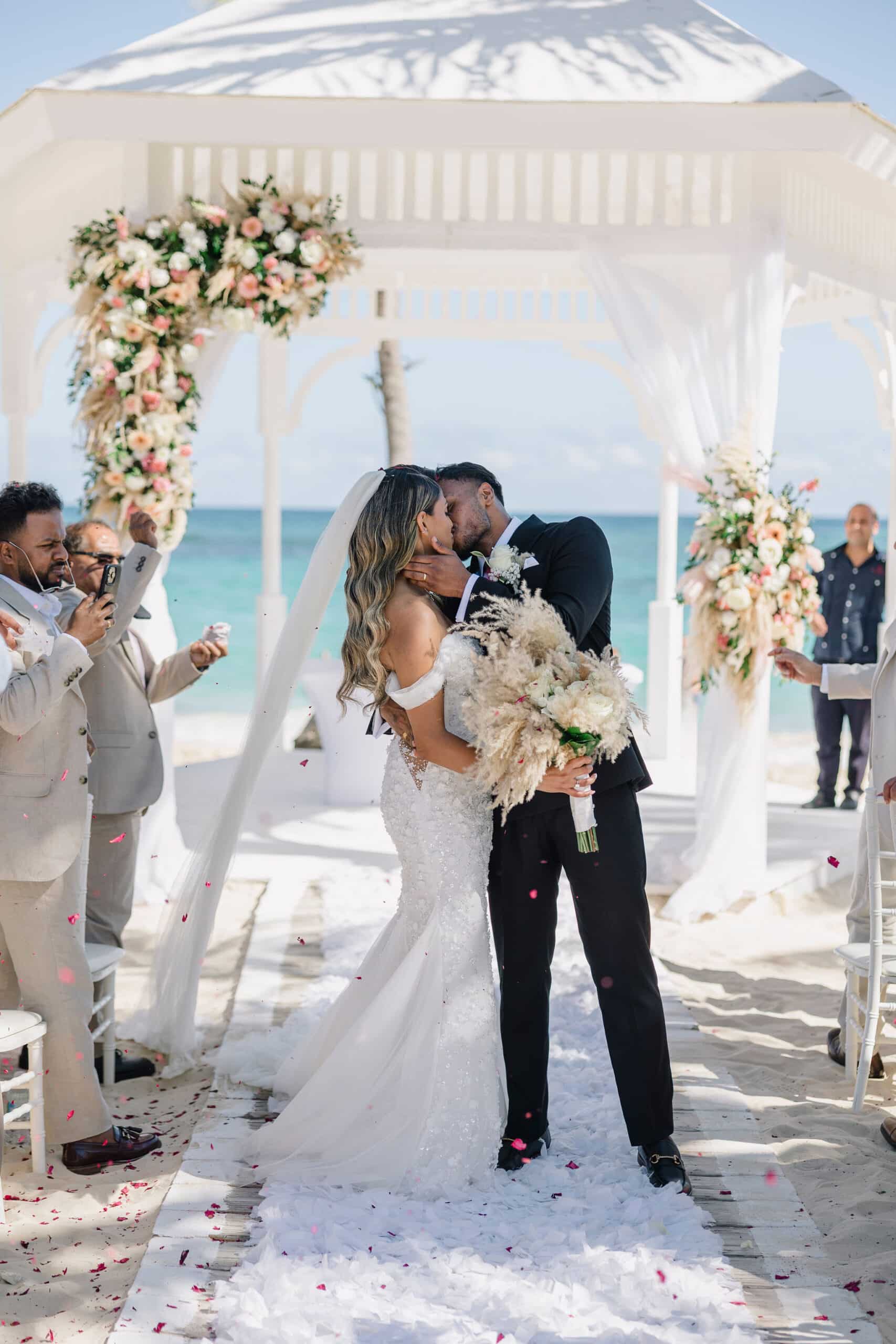 The ceremony itself was nothing short of spectacular. Set on the pristine white sands with a charming gazebo adorned in soft florals, the ocean stretching endlessly behind them, every detail felt like a dream. As Hanshika and Kajalakshan shared their first kiss as husband and wife, the sky exploded with vibrant colors, creating a once-in-a-lifetime moment that felt both cinematic and deeply personal. Guests watched in awe as the joyful energy filled the air, blending tradition and modern celebration seamlessly. The setting, the colors, and the emotions all came together to create a scene that was as unforgettable as it was visually stunning.