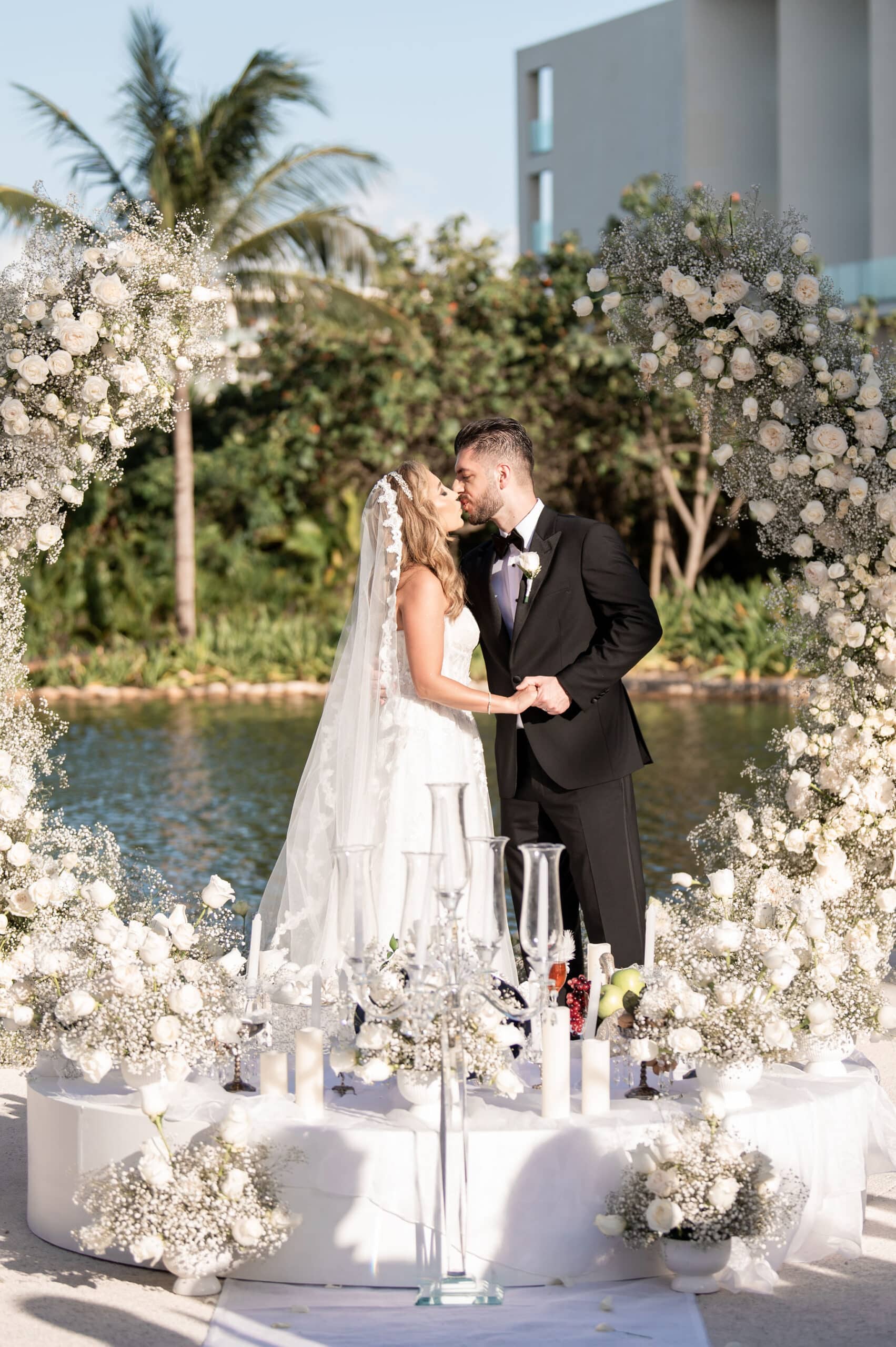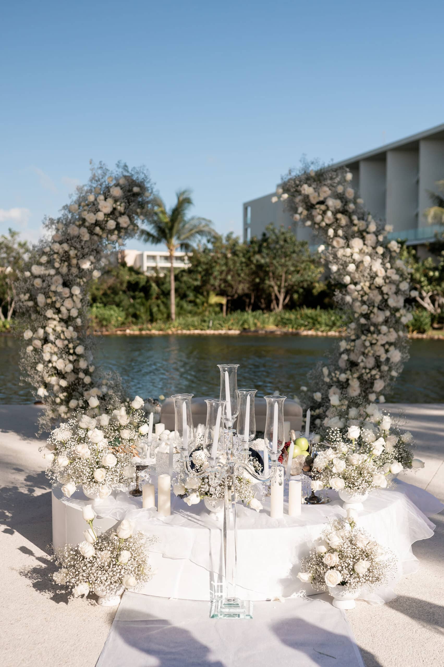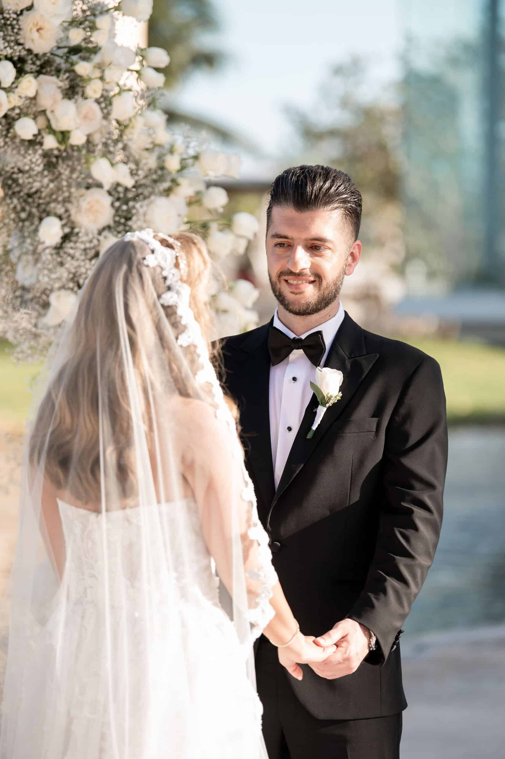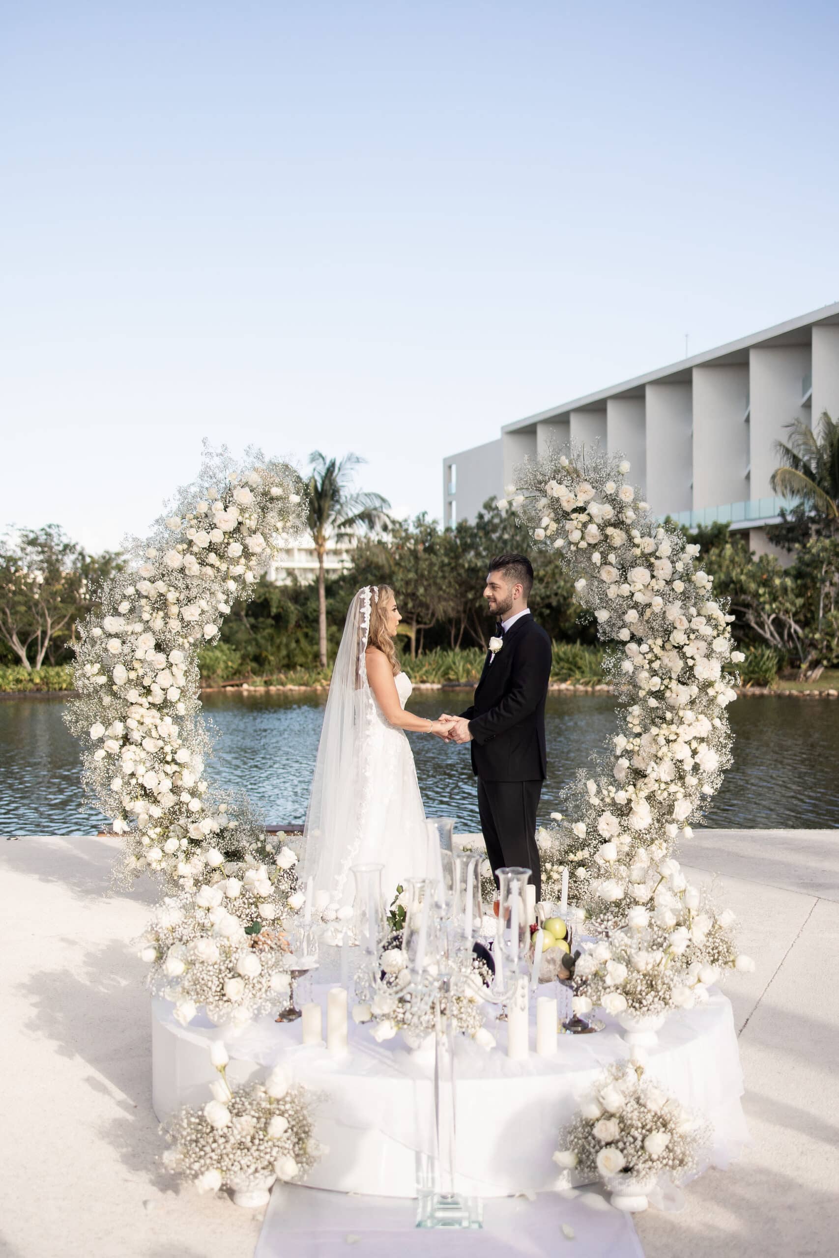 The ceremony was held in an idyllic setting framed by lush greenery and a breathtaking circular floral arch filled with soft white roses and baby’s breath. With the water gently flowing behind them and their closest loved ones watching, Kamelia and Amir exchanged vows with genuine emotion in their voices and tears in their eyes. It was a deeply touching ceremony, full of connection and grace, where every detail was carefully chosen to reflect their story.