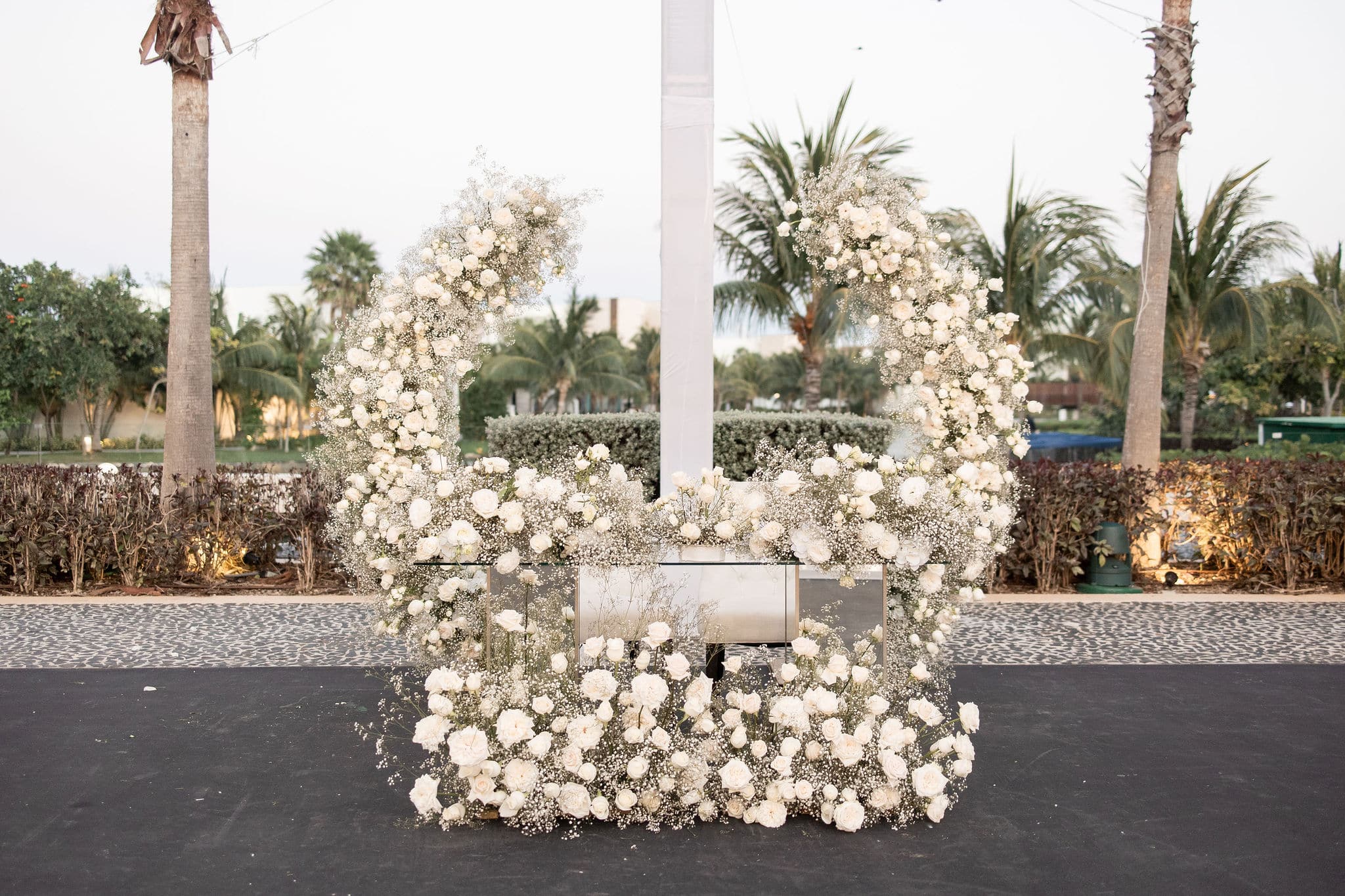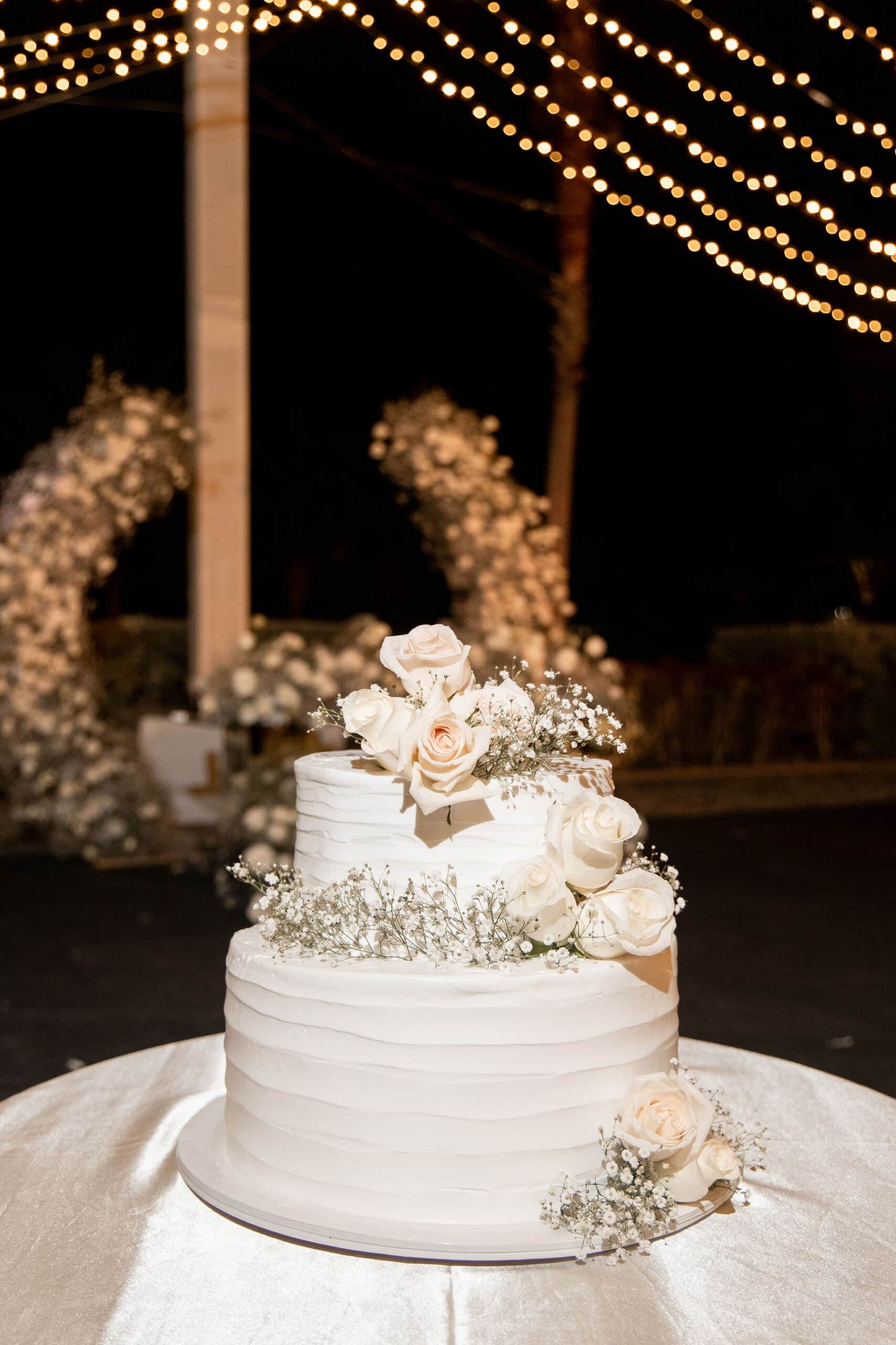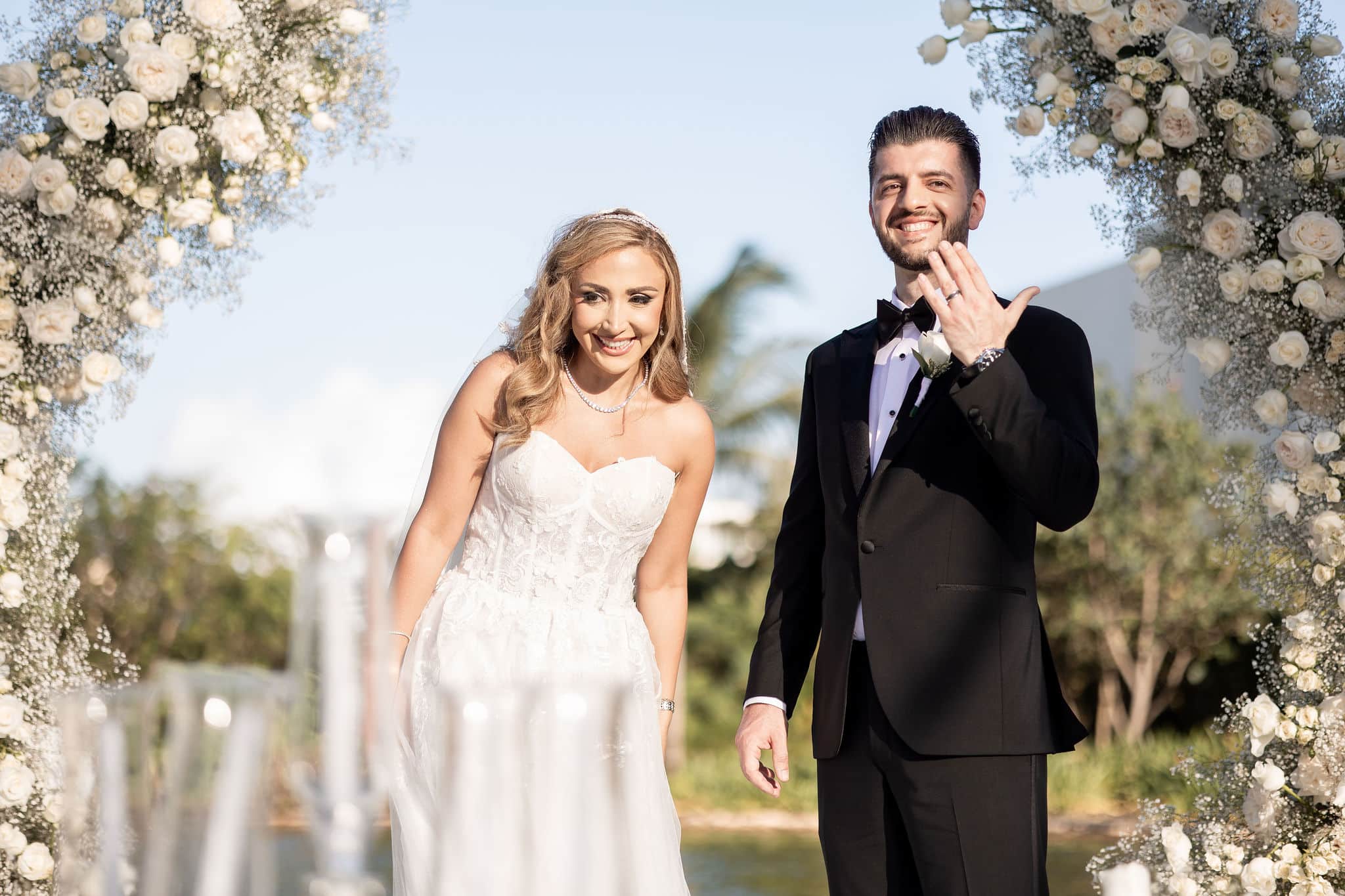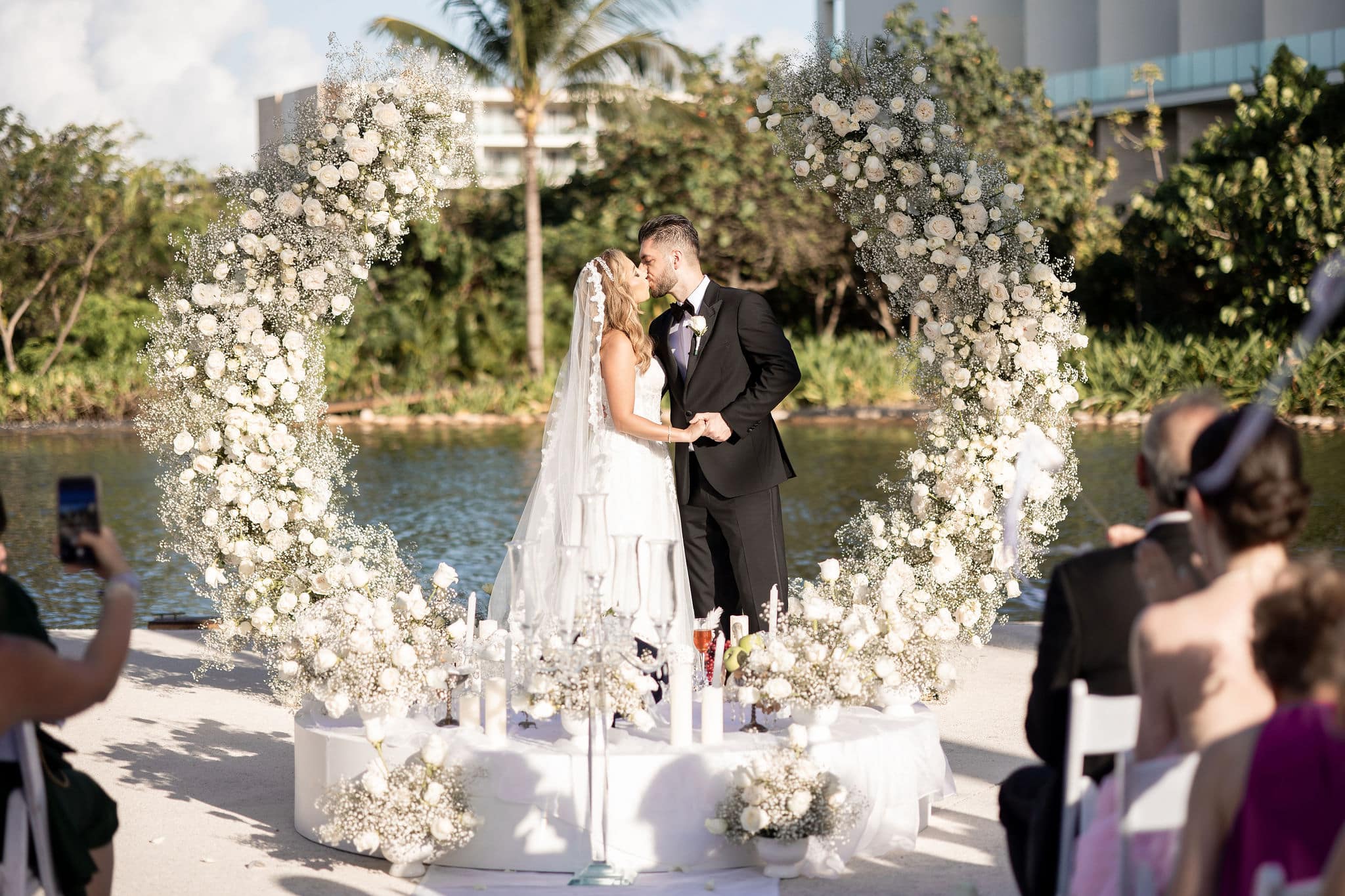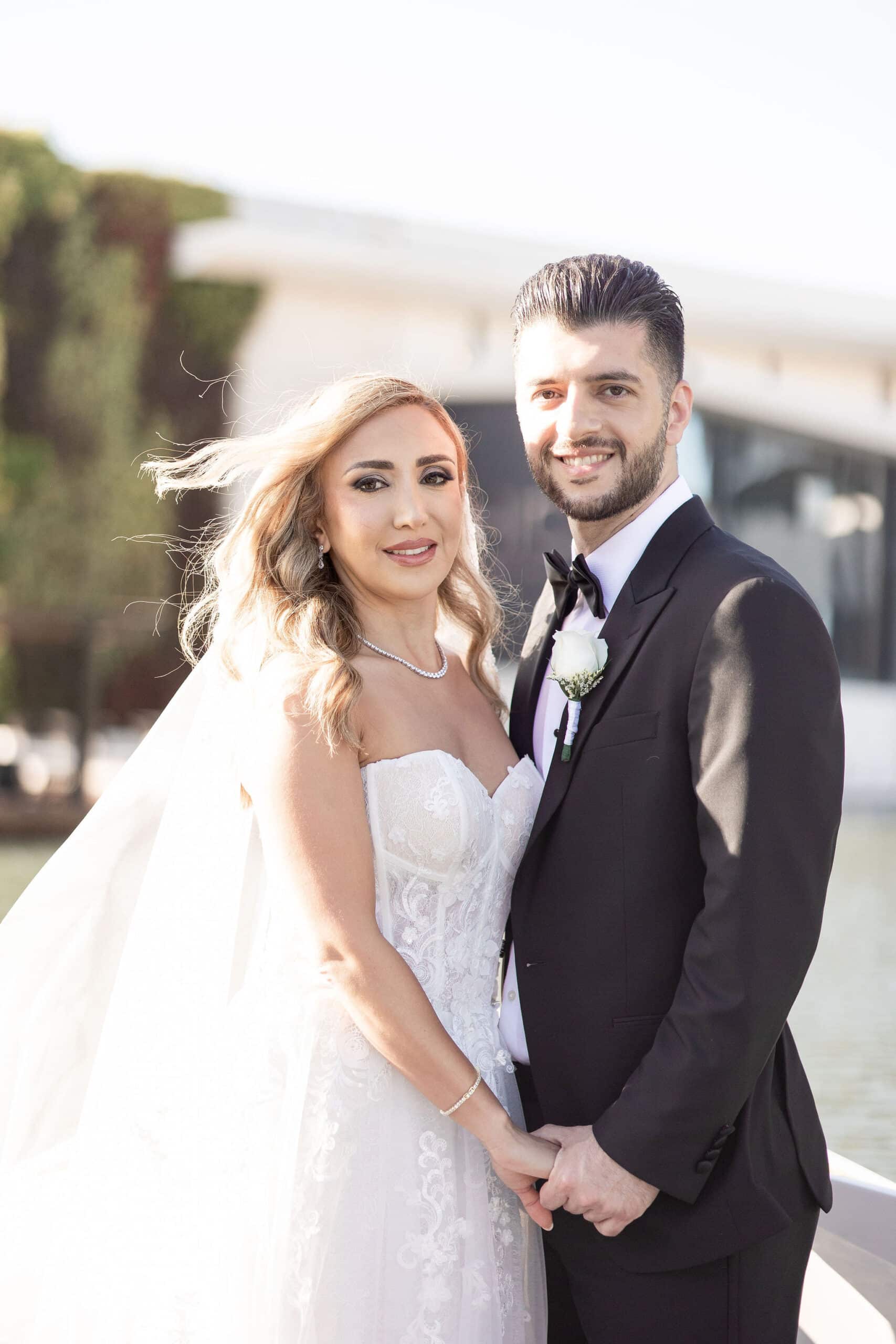 The ceremony was held in an idyllic setting framed by lush greenery and a breathtaking circular floral arch filled with soft white roses and baby’s breath. With the water gently flowing behind them and their closest loved ones watching, Kamelia and Amir exchanged vows with genuine emotion in their voices and tears in their eyes. It was a deeply touching ceremony, full of connection and grace, where every detail was carefully chosen to reflect their story.