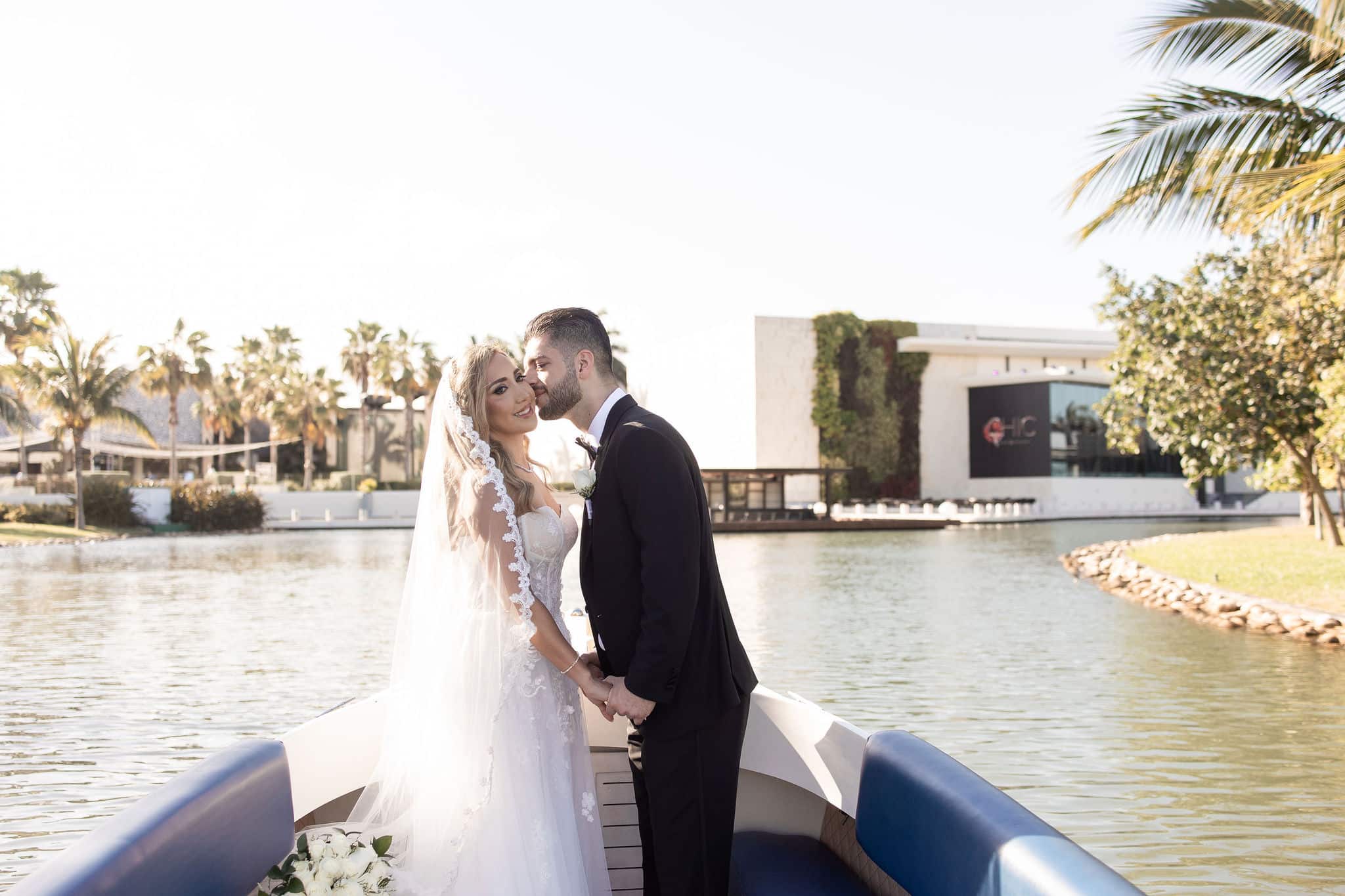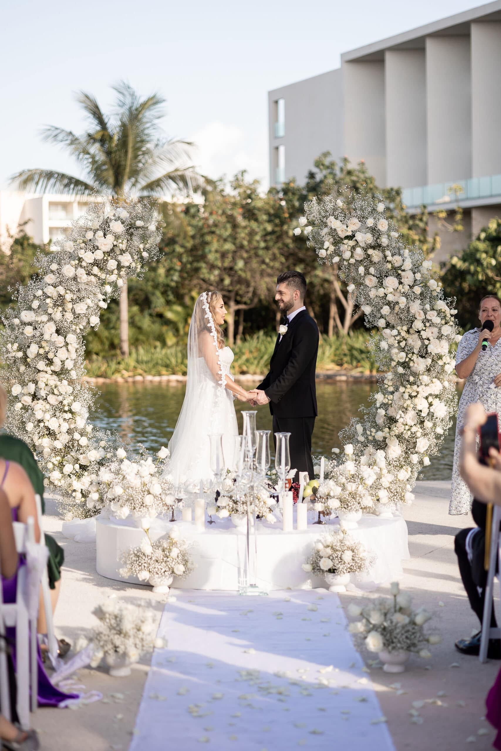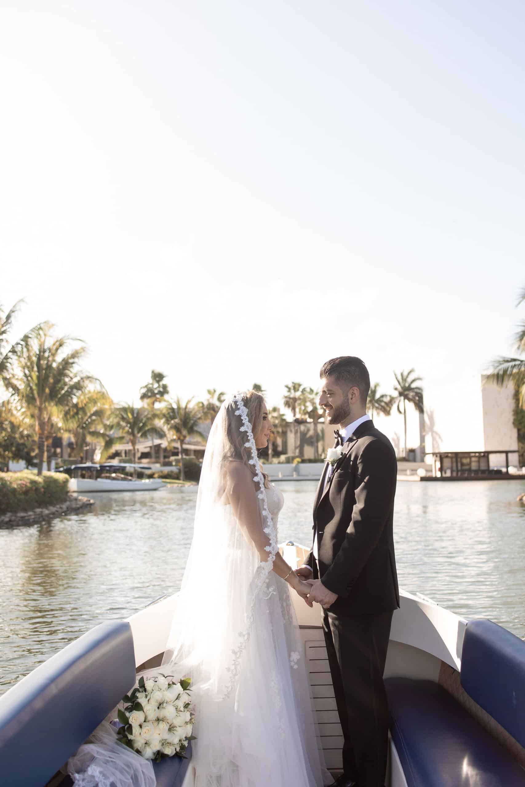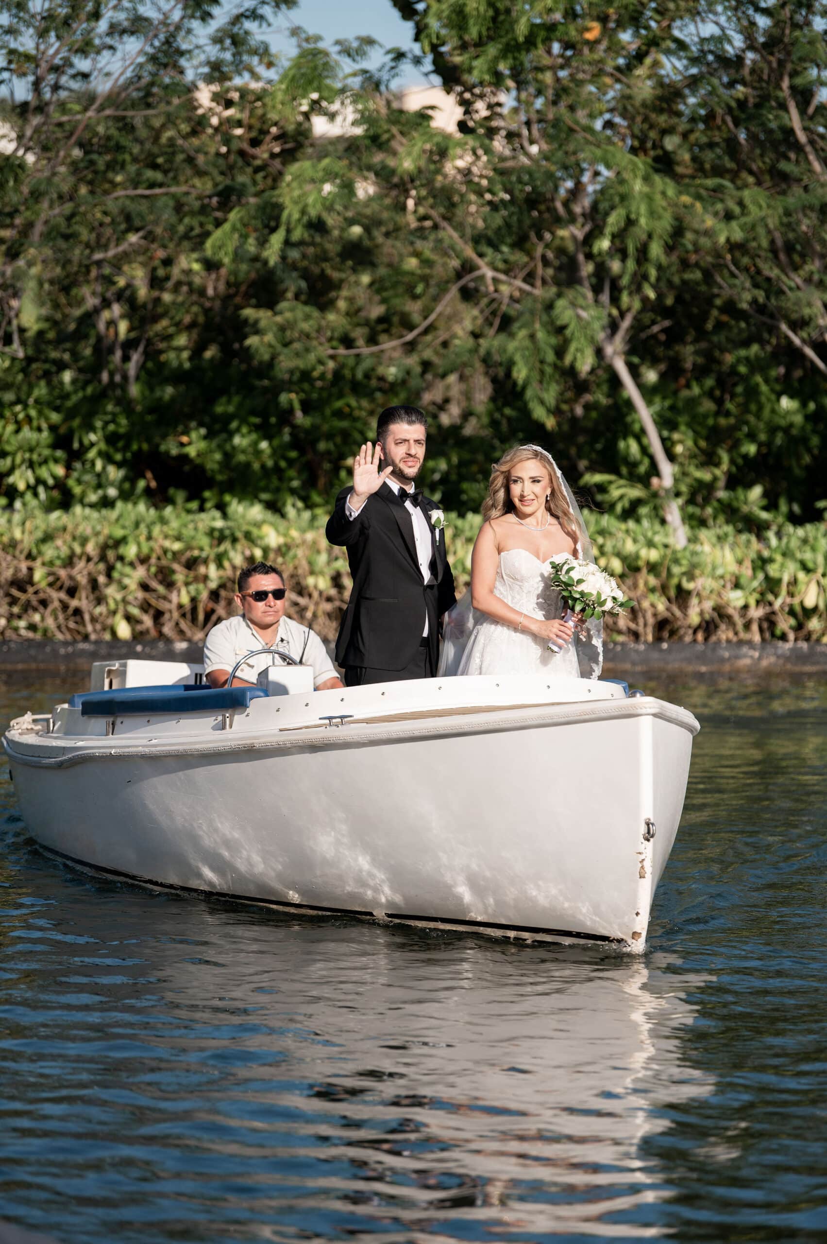 Kamelia and Amir’s wedding at the stunning Grand Palladium Costa Mujeres was a celebration filled with elegance, joy, and heartfelt emotion. Their big day began with a dreamy boat ride through the resort’s tranquil waterways—just the two of them holding hands, stealing kisses, and soaking in the beauty of the moment. Kamelia, in her delicate lace veil and flowing gown, looked ethereal, while Amir stood beside her in a classic black tux, both radiating love and excitement.